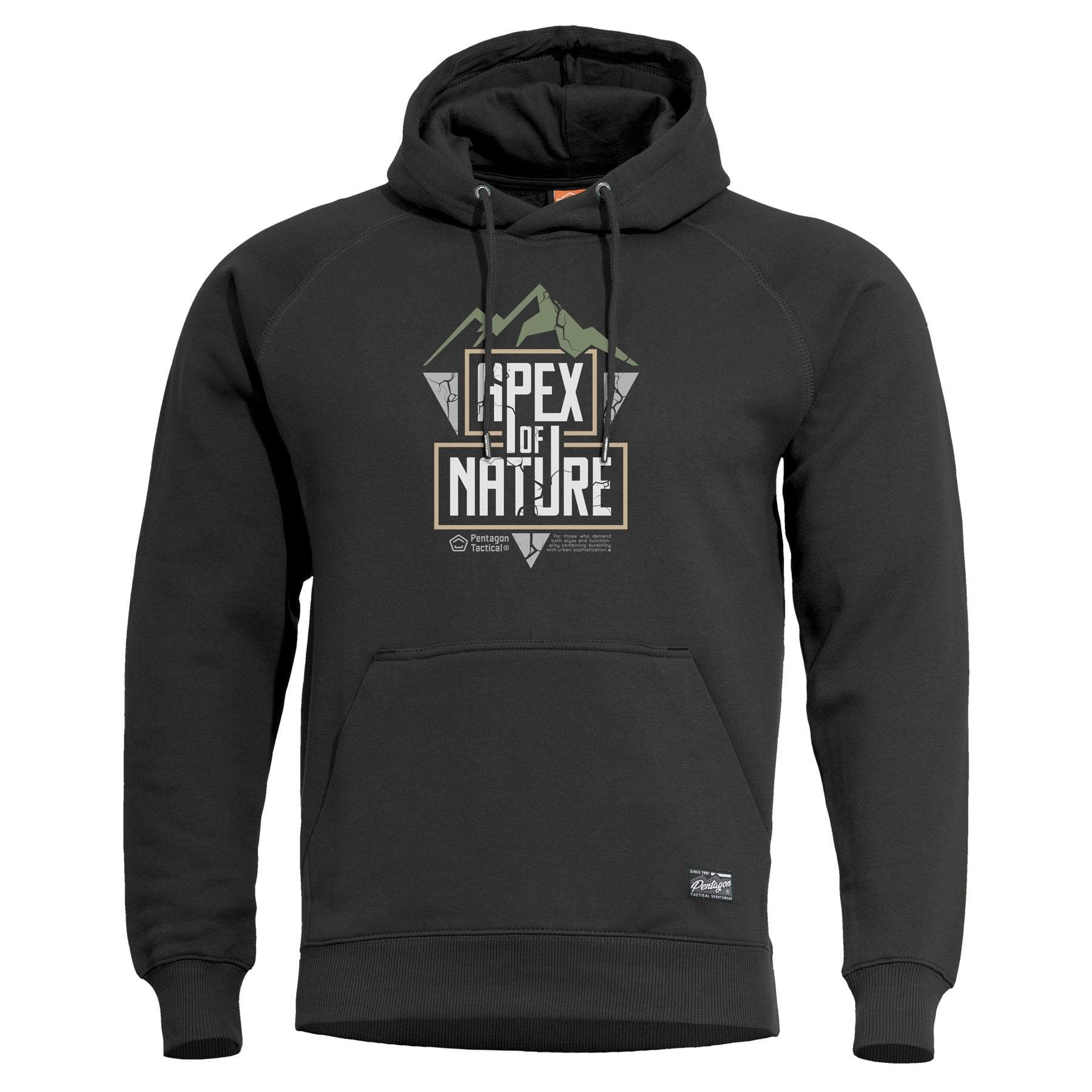Comoda felpa con cappuccio PHAETON del marchio PENTAGON TACTICAL. La felpa è realizzata in materiale morbido e caldo che impedisce la formazione di odori sgradevoli durante l'uso prolungato. Scritta APEX OF NATURE. Ulteriori informazioni
