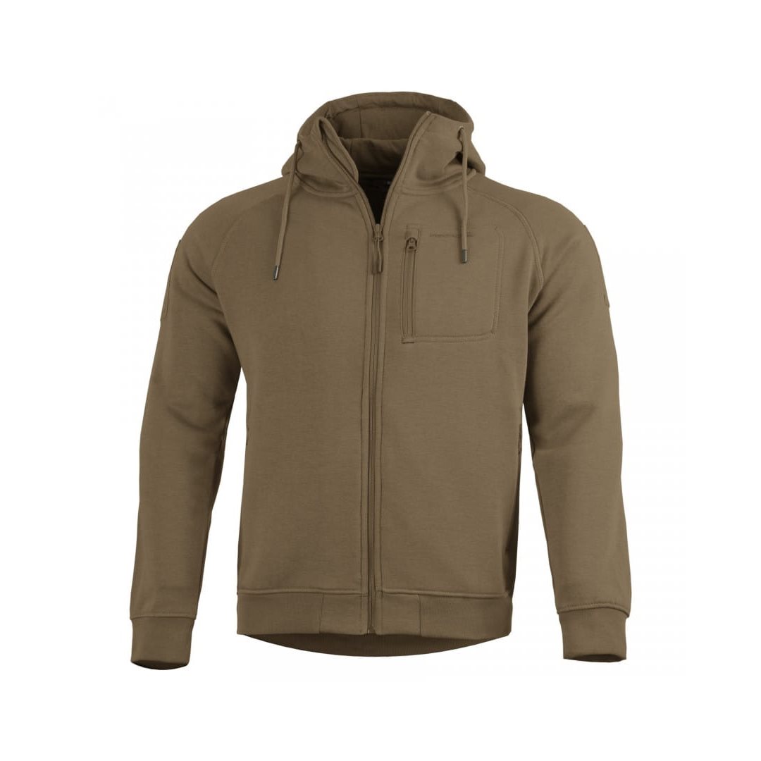 La felpa si chiude con una cerniera centrale, che nella parte superiore è dotata di una protezione per il collo. Le tasche per le mani, situate nella parte inferiore della felpa, hanno ampie aperture chiudibili con cerniera. La tasca sul petto, anch'essa accessibile tramite cerniera, è adatta per riporre piccoli oggetti, smartphone o oggetti di valore. Questa tasca dispone inoltre di un piccolo foro destinato al passaggio del cavo delle cuffie. Le maniche sono di tipo raglan e dispongono di chiusure in velcro per le vostre toppe VELCRO. Il cappuccio della felpa è piuttosto profondo e può essere stretto tramite un cordoncino in tessuto. Le maniche e l'orlo della felpa sono rifiniti con bordi elasticizzati.