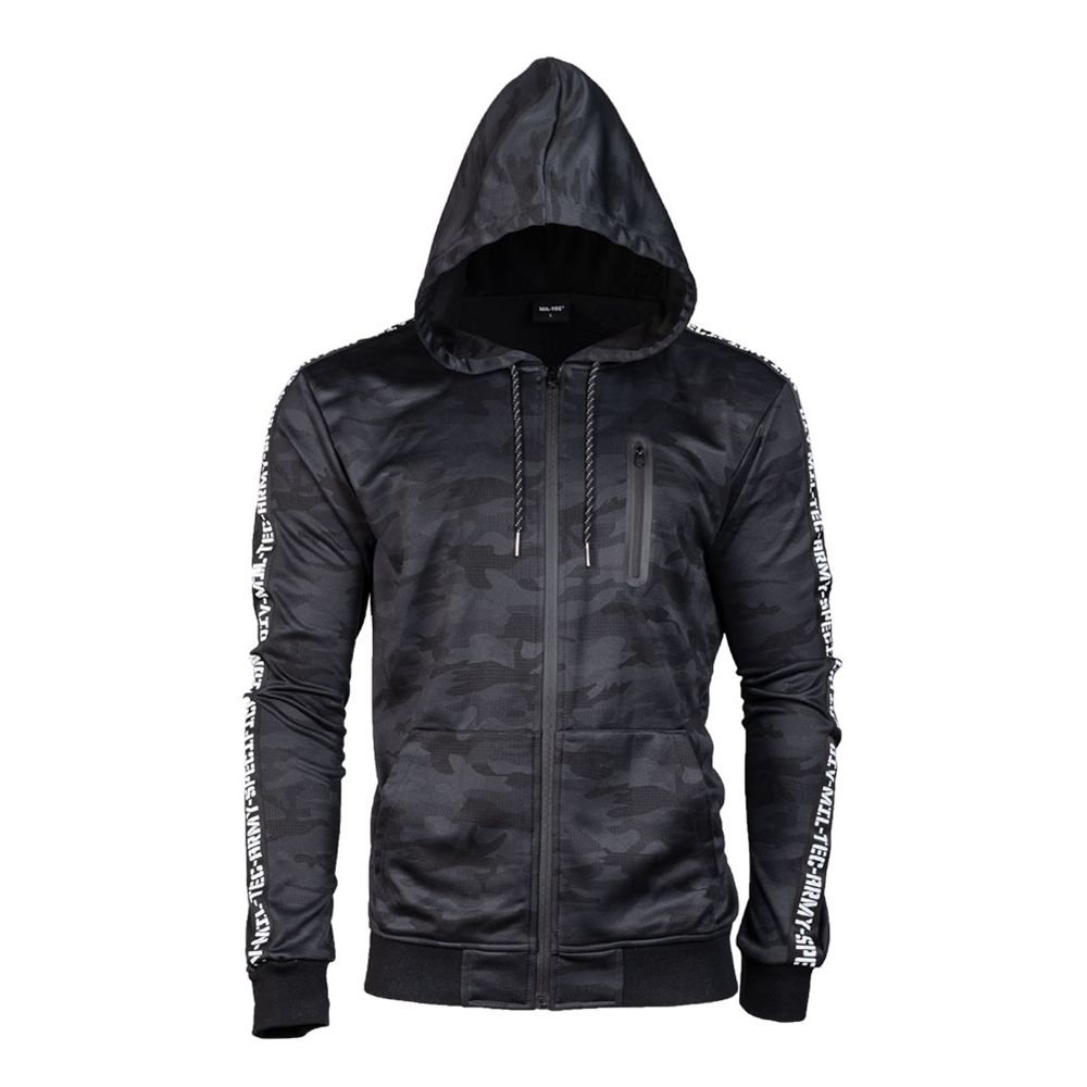 Felpa leggera e comoda con cappuccio in camouflage DARK CAMO del produttore tedesco MIL-TEC. La felpa si chiude con una cerniera impermeabile, ha un cappuccio regolabile e una tasca sul petto, situata a sinistra della cerniera centrale. La felpa presenta strisce con il logo del produttore stampato su entrambe le maniche.