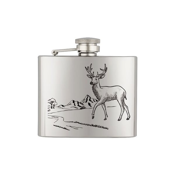 Fiaschetta per bevande con immagine di un paesaggio con cervo sulla parte anteriore. Tappo a vite fissato al corpo della fiaschetta per evitare che venga smarrito dopo essere stato svitato. Capacità: 120 ml, materiale: acciaio inossidabile. Ulteriori informazioni