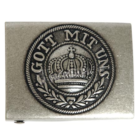 Fibbia metallica con la scritta "GOTT MITT UNS" per cintura in pelle larga 45 mm. Chiusura a gancio. Doppio perno per il fissaggio alla cintura in pelle con interasse di 18 mm.