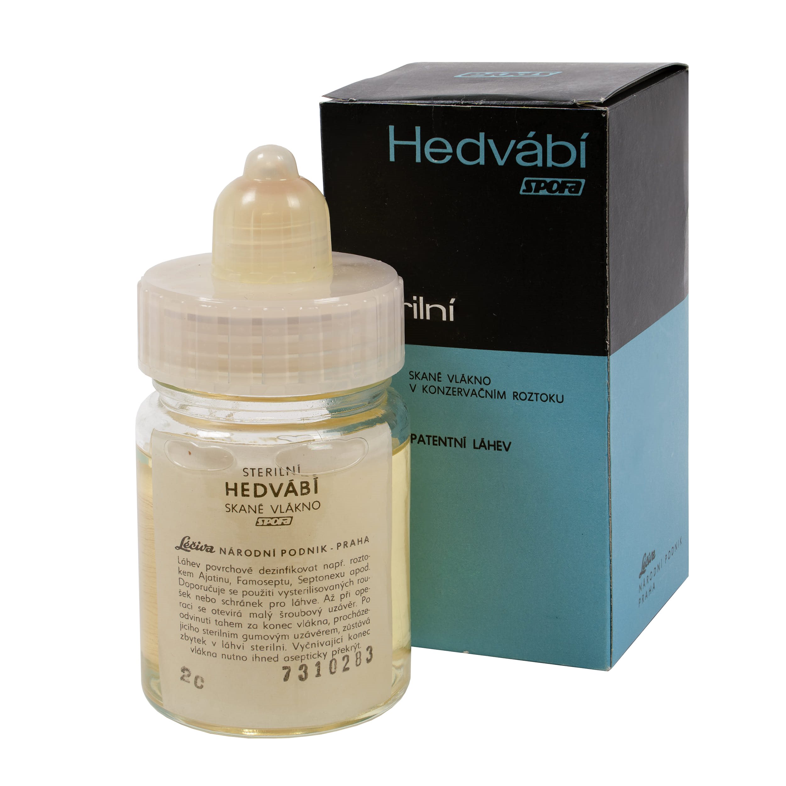 Filo di seta conservato in una soluzione conservante in un flacone di vetro con tappo a vite in acciaio inossidabile. Il filo di seta era utilizzato in interventi medici. Prodotto conservato a lungo senza garanzia di funzionalità. Ulteriori informazioni