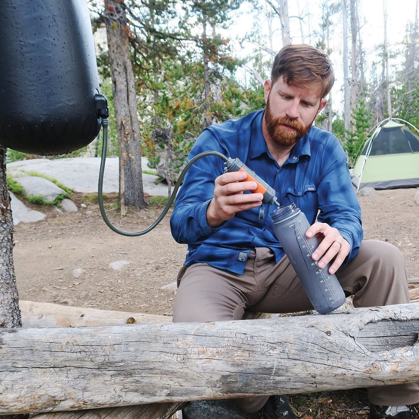 I sistemi a gravità rappresentano un metodo efficace per filtrare grandi quantità d'acqua con il minimo sforzo. È sufficiente appendere il serbatoio contenente l'acqua sporca a un albero. Posizionare il tubo dell'acqua pulita in una bottiglia o in un serbatoio di idratazione e lasciare che la gravità faccia il resto. Ideale per il turismo, il campeggio e l'allestimento di un campo base.