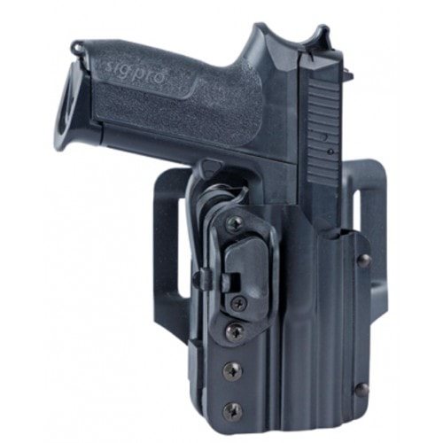 Fondina tattica da cintura per pistola per mancini. È composta da un gancio da cintura e da un corpo rimovibile, entrambi realizzati in plastica resistente mediante tecnologia a iniezione. La fondina è dotata di un fermo PHDLB (Plastic Holster Dasta-Lock Block) che, quando si inserisce l'arma nella fondina, blocca automaticamente il grilletto dell'arma, impedendone la perdita accidentale. Il fermo si sblocca premendo il pulsante, che si trova a portata dell'indice della mano che spara. In questo modo è possibile estrarre l'arma mantenendo la corretta impugnatura. Il movimento del pulsante di sicurezza può essere completamente bloccato tramite un fermo scorrevole passante, che funge da sicurezza durante il trasporto.