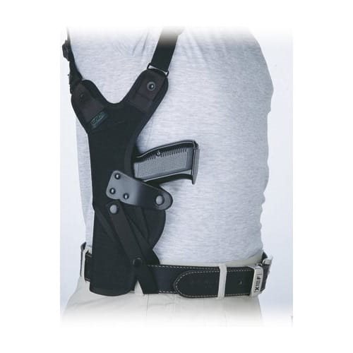 Le fondine ribaltabili sottobraccio combinano il vantaggio di portare un'arma con canna più lunga in posizione verticale e la possibilità di estrarla rapidamente dalla posizione orizzontale.
