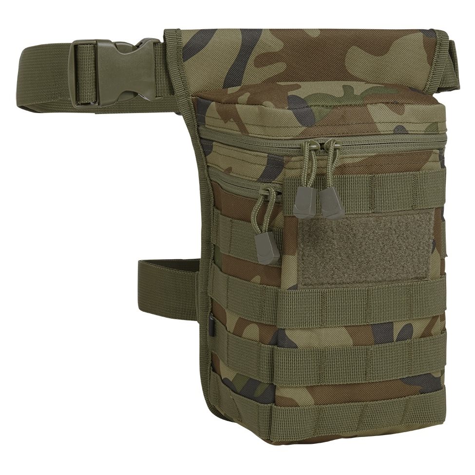 Fondina universale per coscia realizzata in resistente poliestere 600D. Sulla parte esterna della fondina è presente un'ampia quantità di passanti MOLLE/PALS, che possono essere utilizzati per fissare attrezzature aggiuntive, e un ampio pannello in VELCRO per le vostre toppe. Sul lato destro è presente una piccola tasca piatta con chiusura a zip. Lo scomparto principale è accessibile tramite una zip a doppio cursore. L'ultima tasca si trova sul retro.
