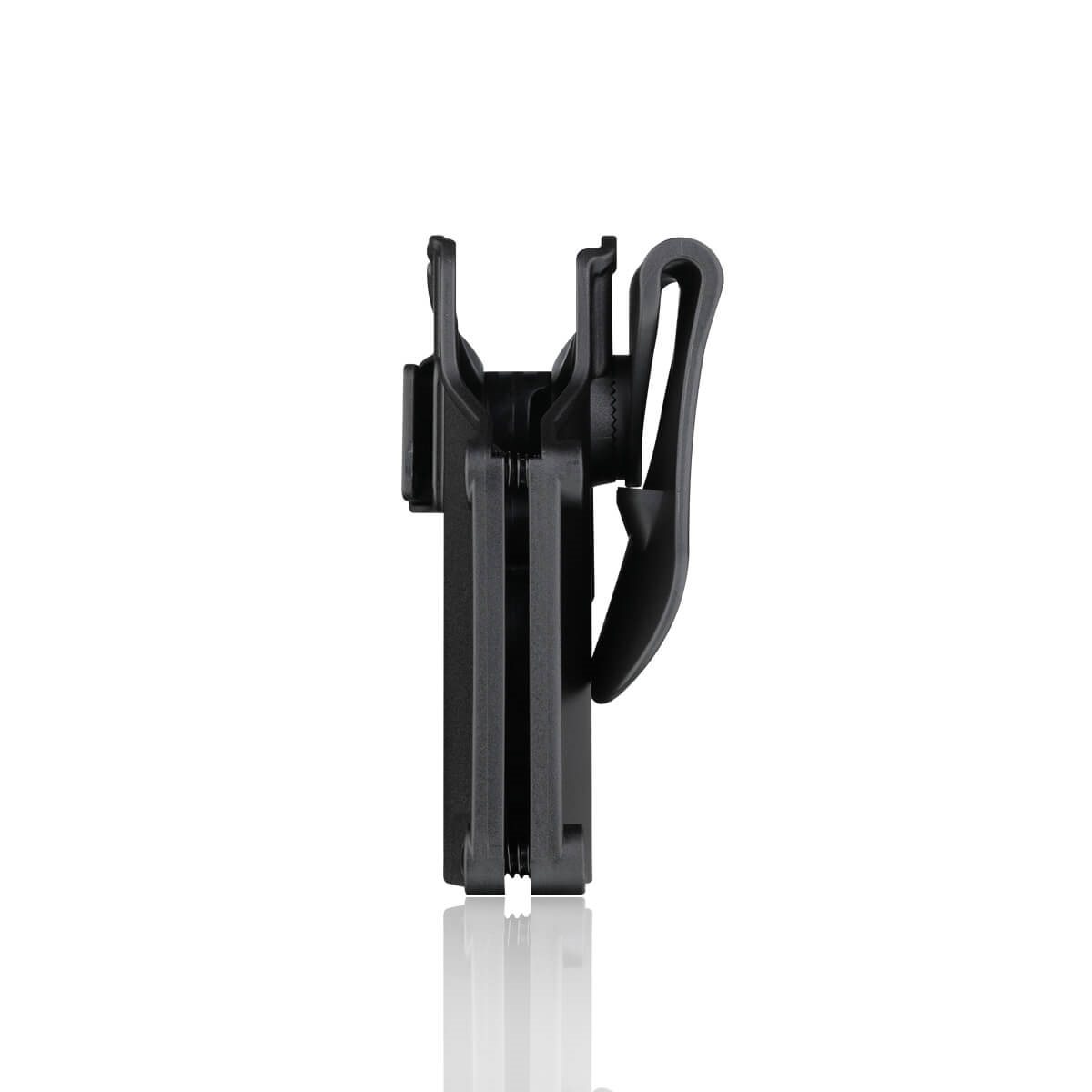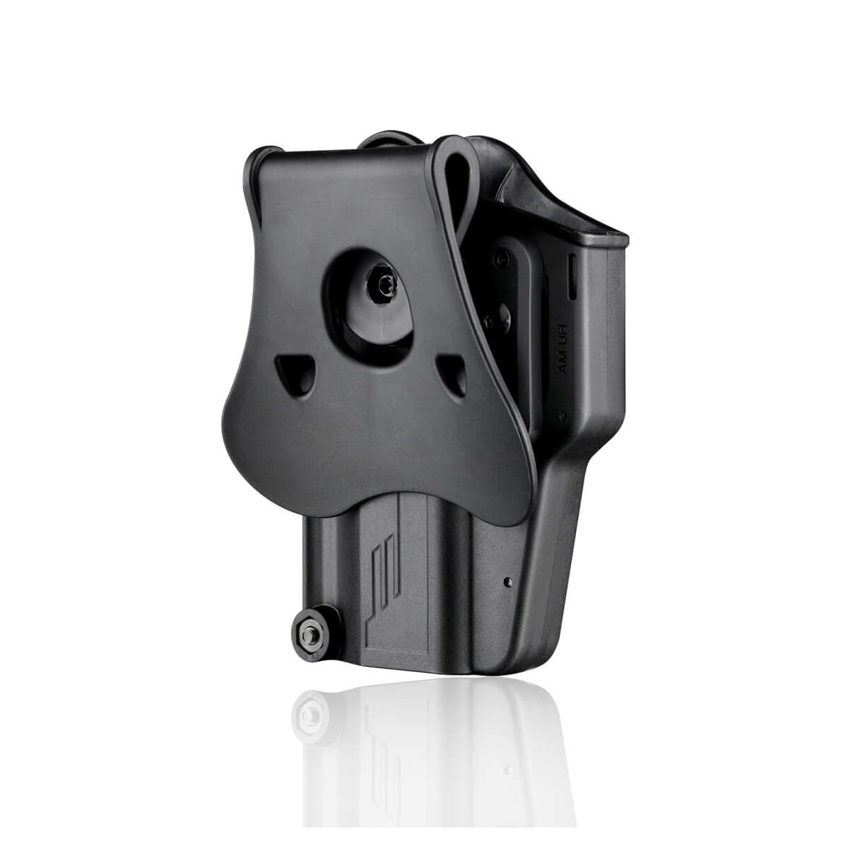 Fondina universale per pistola realizzata in plastica leggera e resistente. Grazie al design ben congegnato e alla coppia di viti di regolazione, è possibile adattare la fondina a un'ampia gamma di armi. La fondina è dotata di una sicura automatica che blocca il grilletto dell'arma. Per sganciare la sicura è presente una leva con un pulsante ben visibile sul lato della fondina. La fondina è dotata di un sistema di montaggio a paletta (paddle) che consente il fissaggio alla cintura con larghezza fino a 50 mm o direttamente al bordo dei pantaloni. L'angolo di inclinazione della fondina sul sistema di montaggio è regolabile a 360°. Il supporto può essere facilmente sostituito con un altro della gamma Amomax (ad es. pannello cosciale) utilizzando una sola vite. Versione per destrimani.