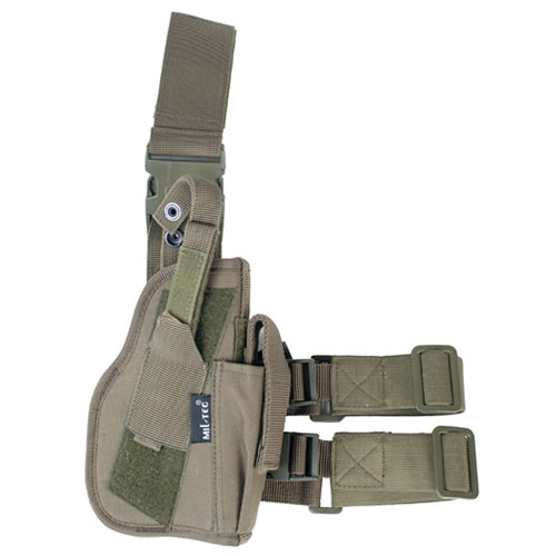 Fondina tattica da coscia per pistola utilizzata dalle forze armate, dalla polizia e dalle unità di sicurezza. Da posizionare sulla coscia destra. Adatta a tutti i tipi di armi corte. Cinghia regolabile per fissare l'arma. Ulteriori informazioni