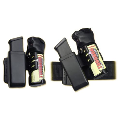 Il doppio portaoggetti girevole in plastica è composto dal portaoggetti MH-04 (per il caricatore) e dal portaoggetti SHT-04 (per lo spray) collegati tramite un adattatore speciale. Il vantaggio di questa soluzione è il risparmio di spazio sulla cintura. La posizione costante del caricatore e dello spray migliora l'orientamento sulla cintura nella scelta del prodotto appropriato. Entrambi i fondelli ruotano insieme rispetto alla cintura, mantenendo la loro posizione reciproca.