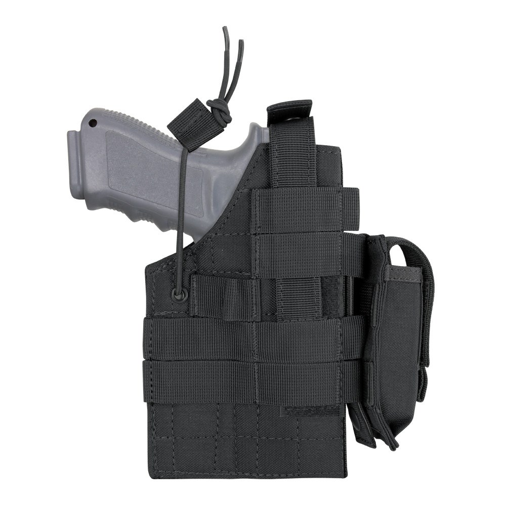Fondina per pistole Glock calibro 9 mm, .40 S&W e .45 GAP. Per il fissaggio al sistema MOLLE, può essere posizionata sia sul lato destro che sul lato sinistro. Fissaggio dell'arma tramite cinturino con chiusura a scatto e cordino elastico. Tasca separata staccabile per il caricatore.