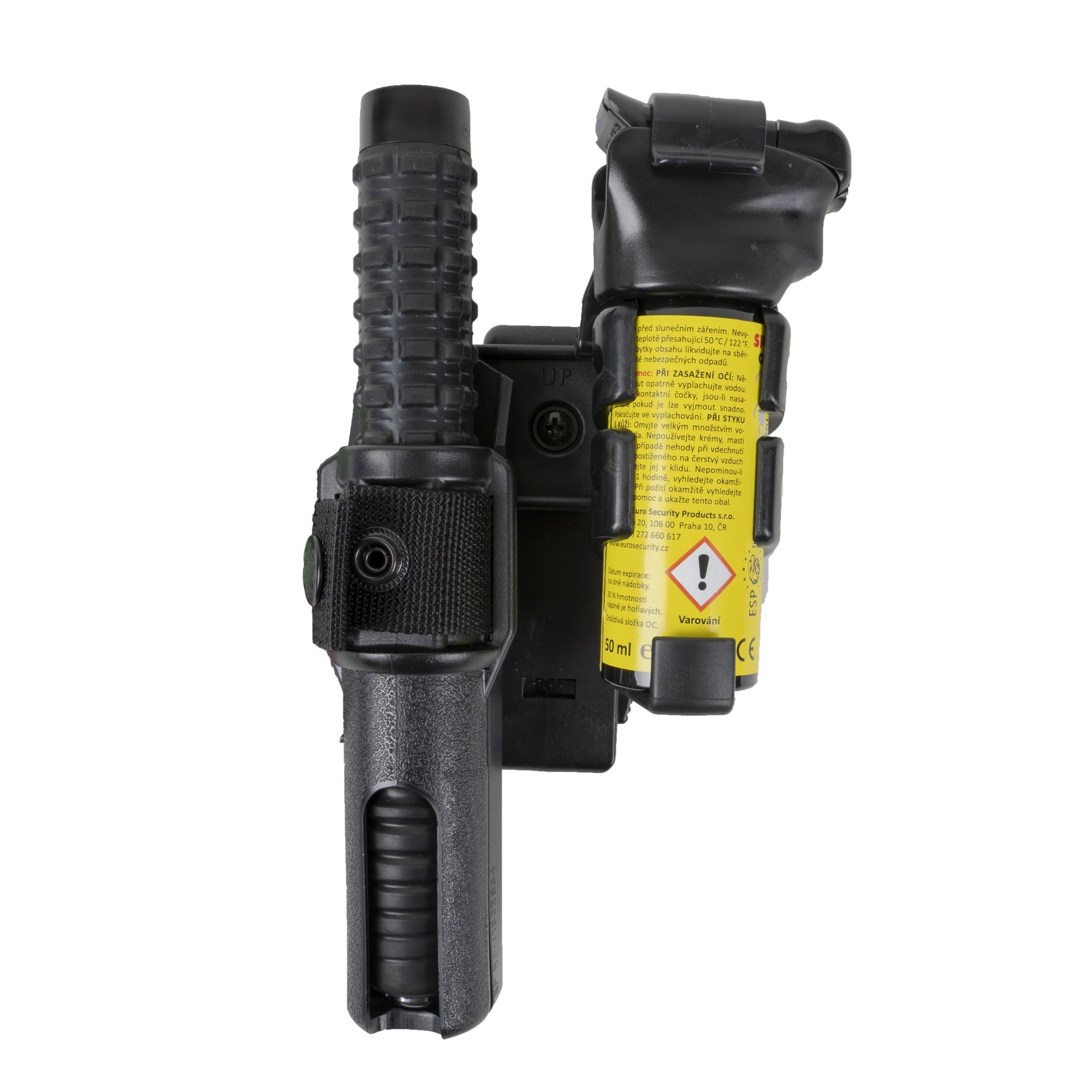 Il doppio fondina girevole in plastica è composto dal fondina BH-03 (per manganelli di lunghezza 21", 23" e 26") e dal fondina SHU-14 (per spray) collegati da un adattatore speciale. Il vantaggio di questa soluzione è il risparmio di spazio sulla cintura. La posizione costante del manganello e dello spray migliora l'orientamento sulla cintura nella scelta dello strumento appropriato. Entrambi i fondine ruotano insieme rispetto alla cintura e la loro posizione reciproca rimane invariata. L'adattatore consente di adattare facilmente le custodie per essere indossate sul lato destro o sinistro. Questo tipo di custodia utilizza un modello di fibbia piatta a sgancio rapido, che consente anche di agganciarla rapidamente alla cintura con una sola mano senza doverla slacciare. Tuttavia, la distanza tra la cintura e la fondina è minore quando si utilizza questo tipo di fibbia. La fondina può essere ruotata di 360 gradi rispetto alla cintura in 16 posizioni bloccabili. Può anche essere fissata al sistema di trasporto M.O.L.L.E.