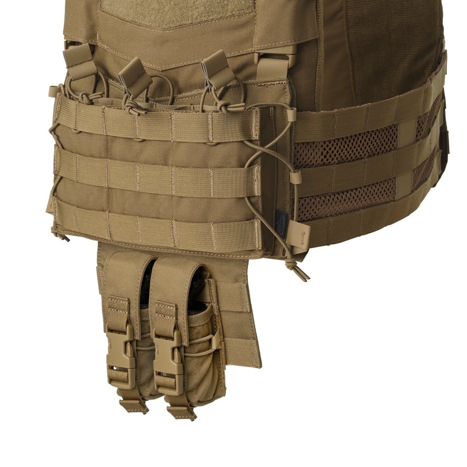 Pratica custodia sospesa progettata per il trasporto di accessori tattici, kit di pronto soccorso, pinze multifunzionali e attrezzature di dimensioni simili. La custodia è fissata al gilet tramite una piattaforma posteriore rimovibile con chiusura in velcro; in alternativa, è possibile utilizzare l'interfaccia MOLLE/PALS oppure indossare la custodia come marsupio grazie alla tracolla rimovibile. Se necessario, la piattaforma posteriore rimovibile può essere utilizzata per fissare ulteriori tasche e custodie sotto il gilet.