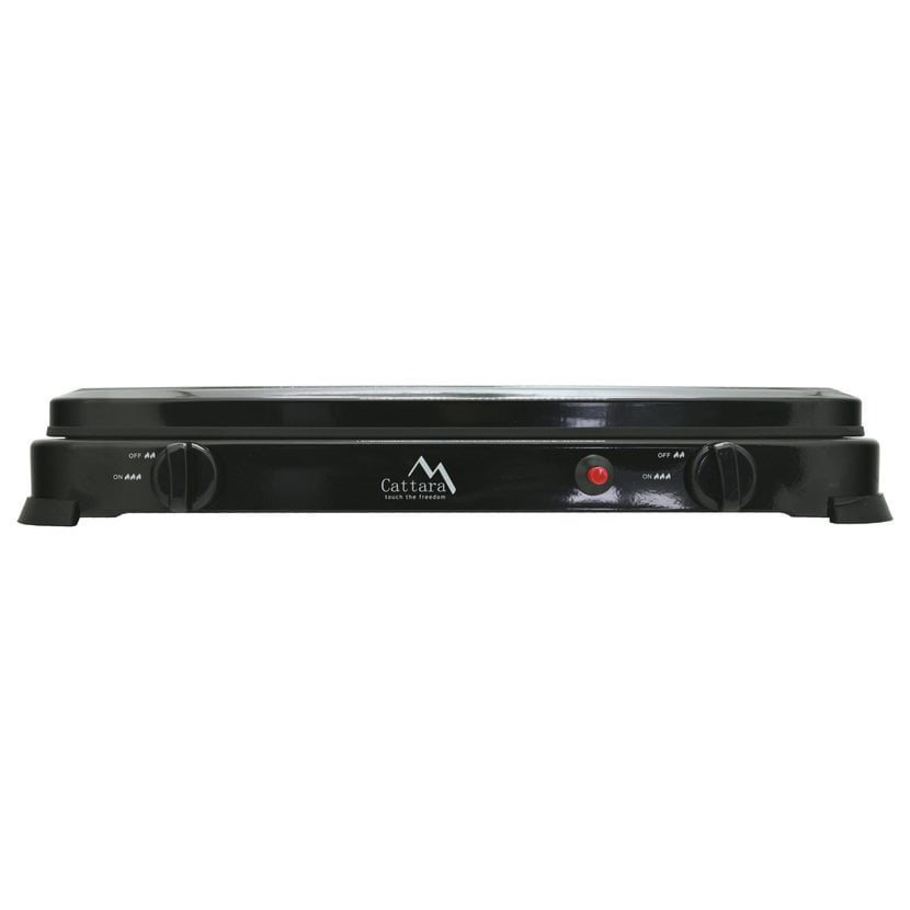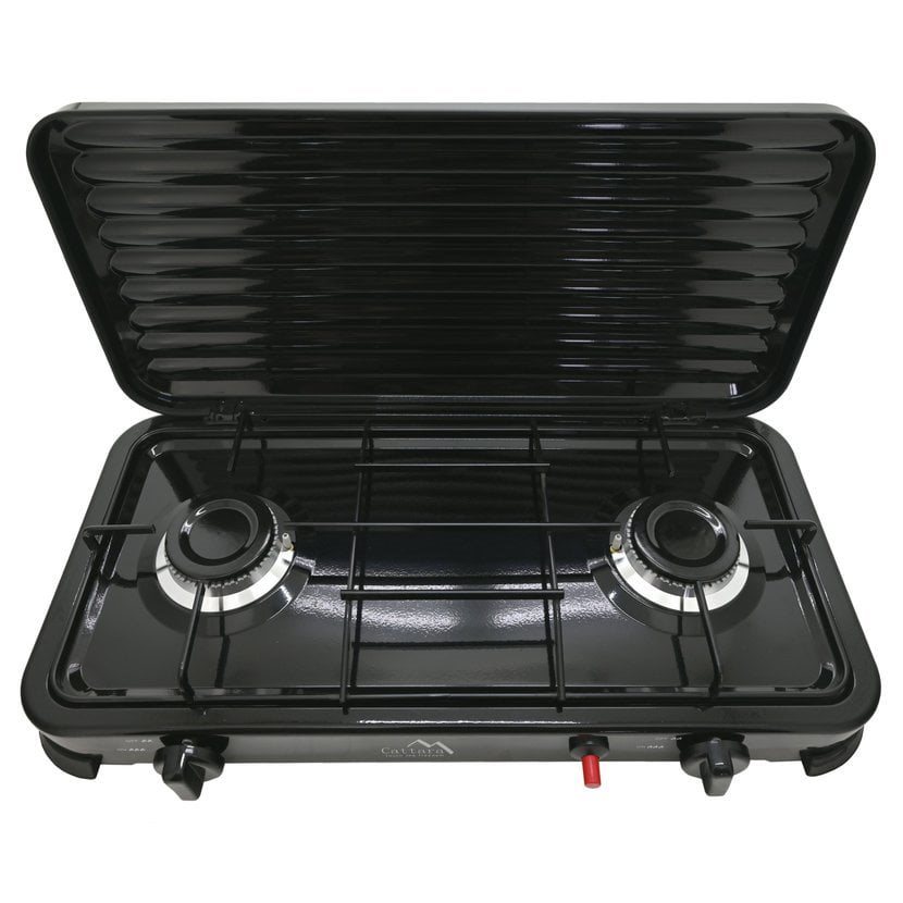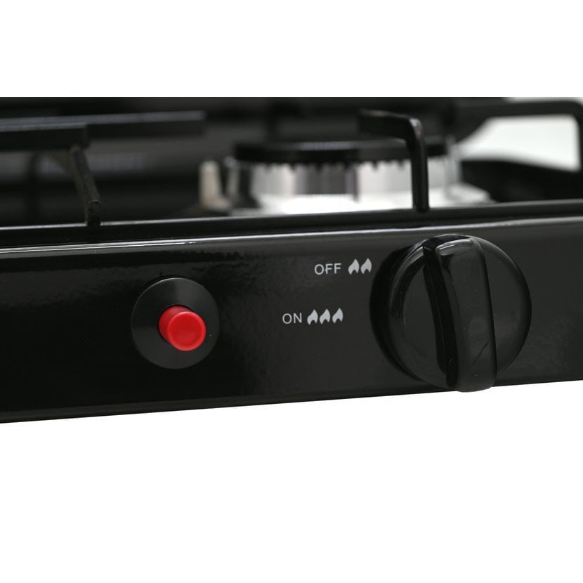 Fornello a gas propano-butano a due fuochi per riscaldare e preparare i pasti in campeggio o in giardino. La facilità d'uso del fornello in ambienti esterni è garantita da 2 bruciatori con accensione piezoelettrica e flusso di gas regolabile in modo continuo per ciascun bruciatore separatamente.
