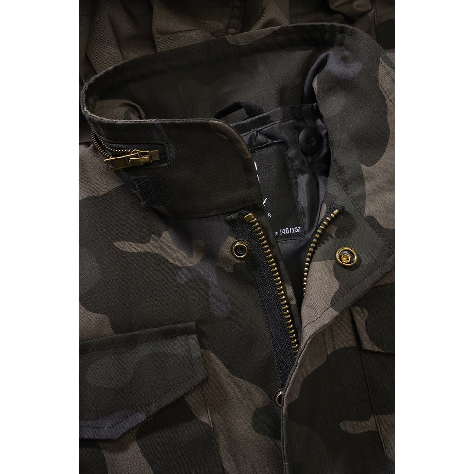 Giacca per bambini di alta qualità basata sul modello ormai leggendario della giacca M65. Per la sua produzione è stato utilizzato un resistente materiale misto con trattamento idrorepellente. La giacca si chiude con una robusta cerniera coperta da una patta con bottoni a pressione, mentre sulla parte anteriore sono presenti quattro ampie tasche con patta. Per migliorare le proprietà termiche, la giacca è dotata di un'imbottitura rimovibile, mentre il cappuccio che protegge dalle intemperie è riposto nel colletto. I polsini delle maniche sono regolabili con velcro, mentre l'orlo inferiore della giacca può essere regolato con un cordino con fermo.