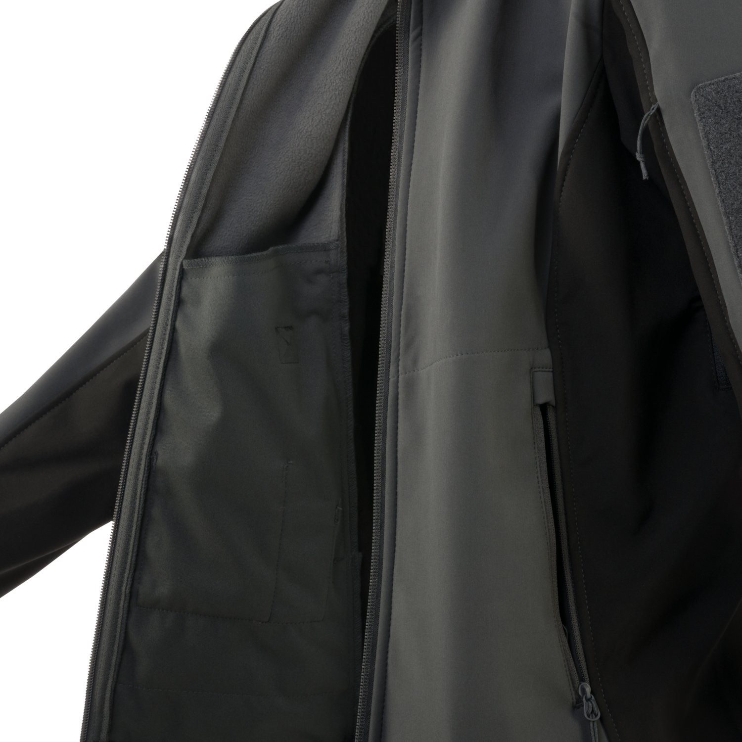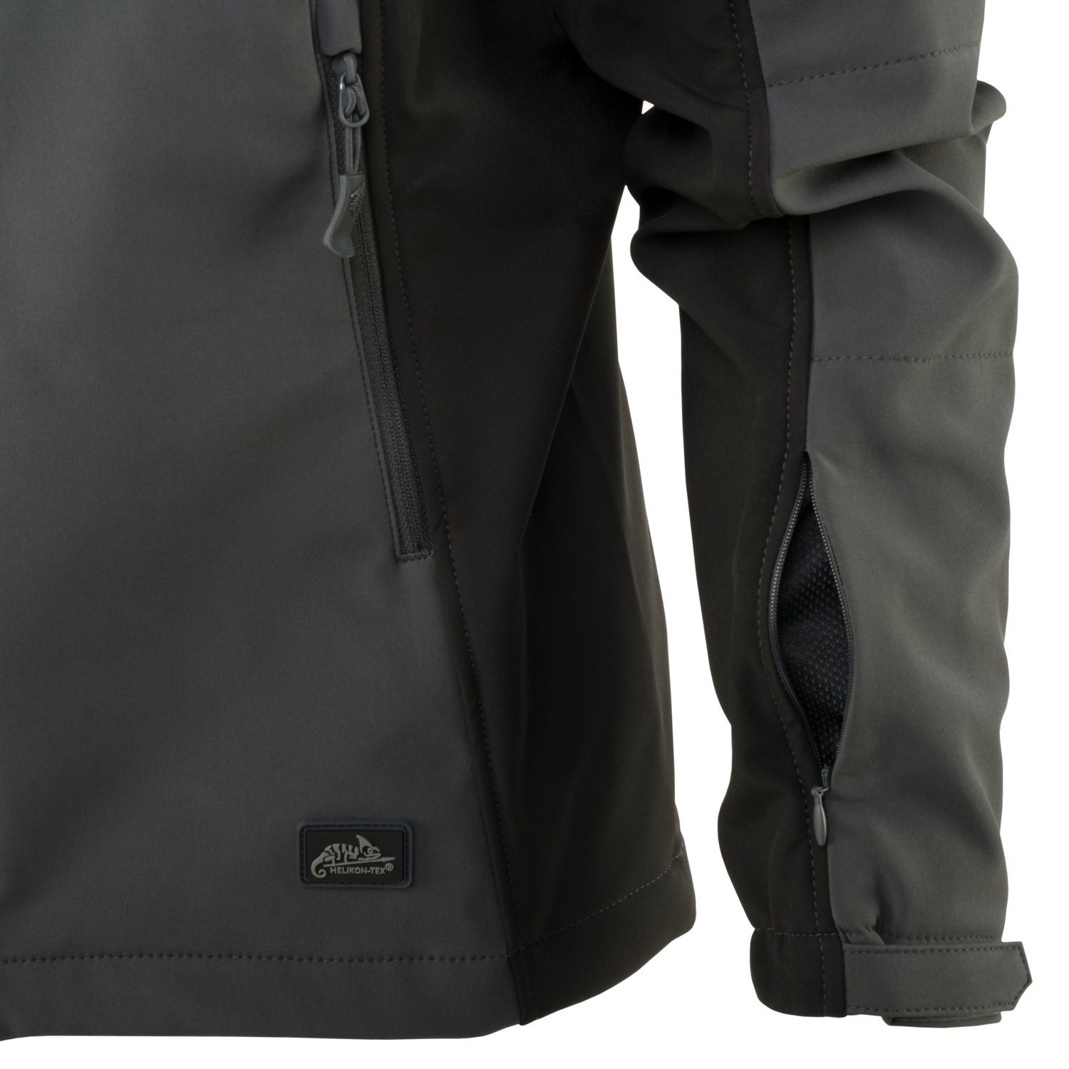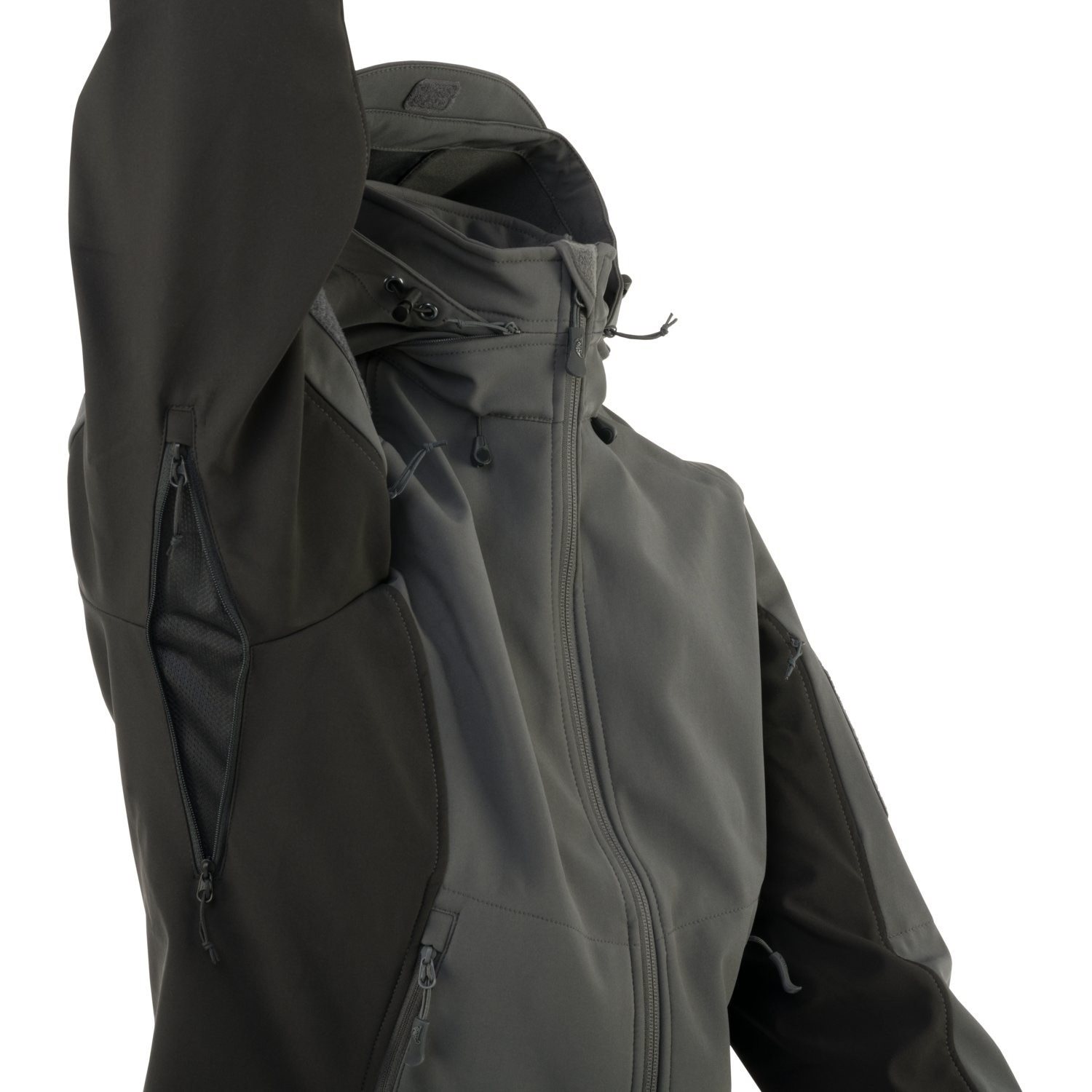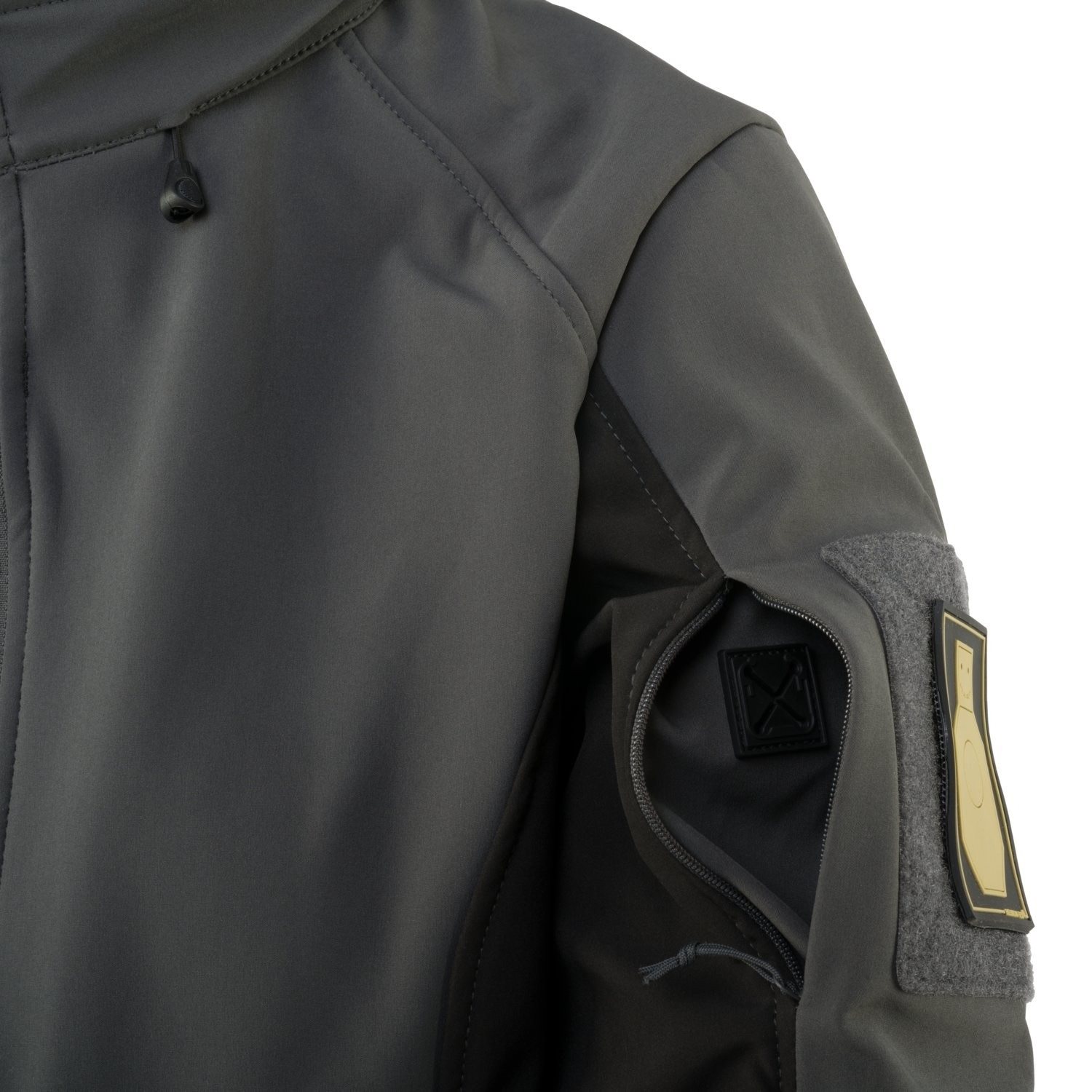 Giacca softshell leggera da donna Gunfighter realizzata in Shark Skin, un tessuto elastico a tre strati che offre un adeguato isolamento termico, protezione dal vento e dall'umidità e allo stesso tempo è molto traspirante. La superficie esterna è rivestita in teflon per una migliore protezione dall'acqua e dallo sporco. L'interno è foderato in morbido pile e rete. Il cappuccio può essere facilmente regolato senza togliere le mani dalle tasche grazie ai cordoncini nascosti in entrambe le tasche anteriori.
