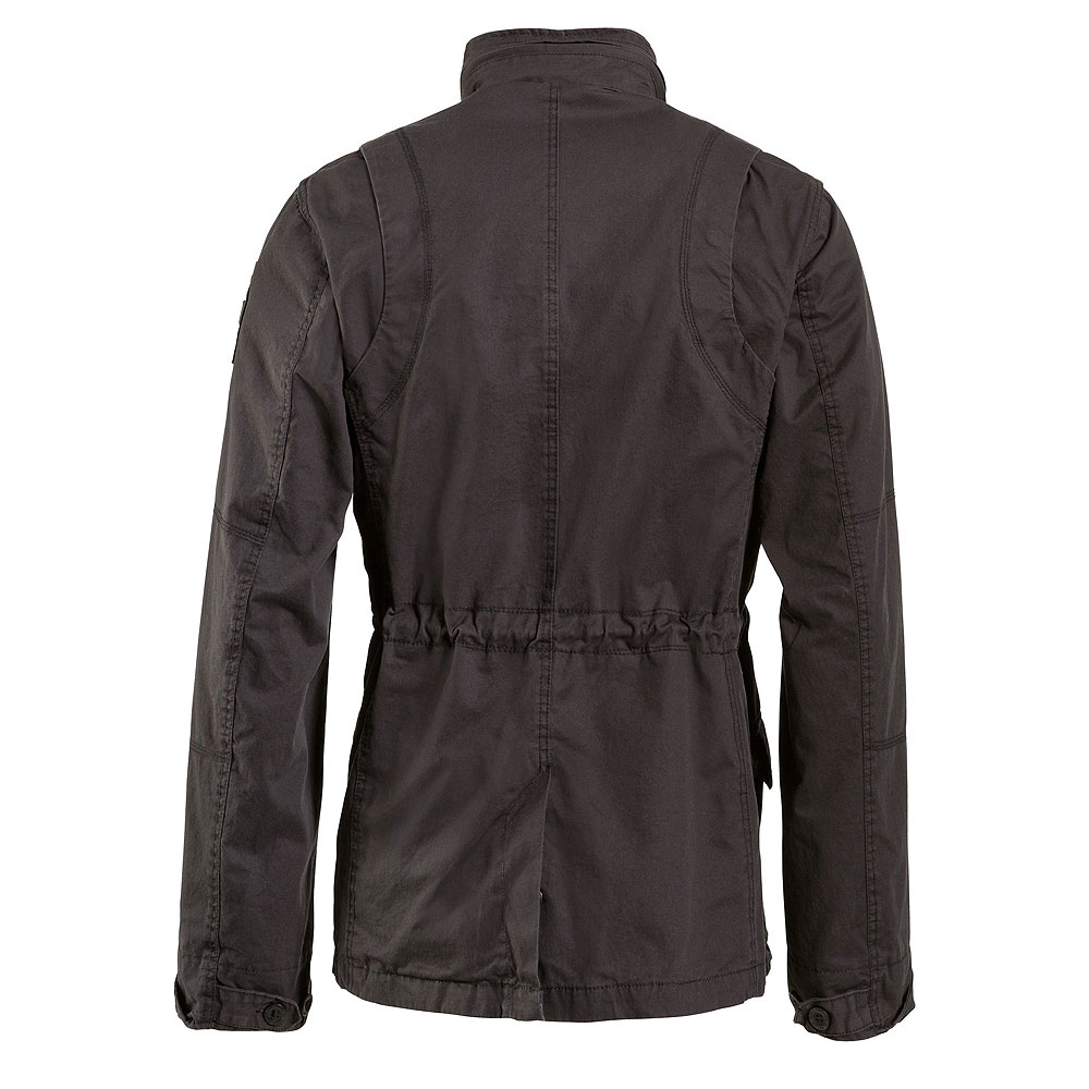 Giacca vintage in stile tipico giacca da campo, dal taglio perfettamente aderente e leggermente allungato. La giacca presenta un collo alto di tipo stand-up che nasconde un leggero cappuccio in nylon. La chiusura è realizzata con una classica cerniera, coperta da una patta con bottoni automatici in metallo, che protegge chi la indossa dal vento. Sulla parte anteriore sono presenti quattro tasche: due classiche sulle braccia e due sul petto per gli oggetti di valore. Tutte e quattro le tasche sono chiuse da una patta con bottoni. Altre due tasche sono presenti all'interno e sono chiuse da una cerniera. I polsini delle maniche sono regolabili tramite una cintura con bottoni, mentre la circonferenza della vita può essere regolata tramite un cordoncino interno. Per migliorare la mobilità, la giacca è dotata di una breve apertura posteriore che può essere chiusa con un bottone a pressione, se necessario. La giacca non è imbottita, ma ha una fodera leggera e aperture di ventilazione sotto le ascelle. Il rivestimento esterno della giacca ha un trattamento speciale che offre resistenza agli agenti atmosferici.