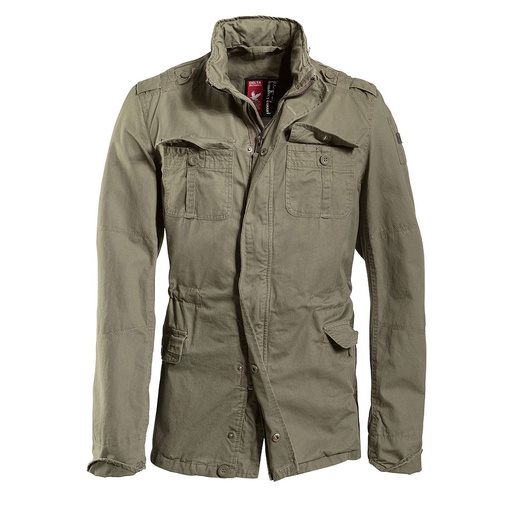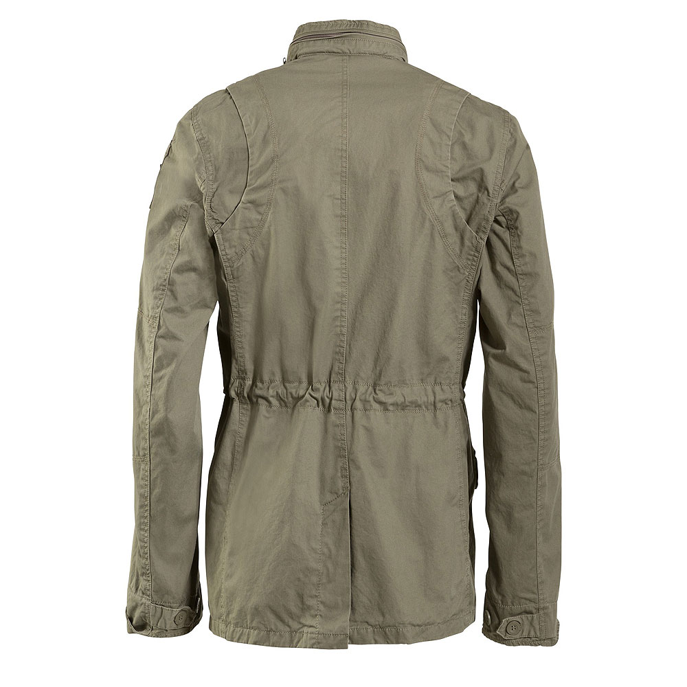 Giacca vintage in stile tipico giacca da campo, dal taglio perfettamente aderente e leggermente allungato. La giacca presenta un collo alto di tipo stand-up che nasconde un leggero cappuccio in nylon. La chiusura è realizzata con una classica cerniera, coperta da una patta con bottoni automatici in metallo, che protegge chi la indossa dal vento. Sulla parte anteriore sono presenti quattro tasche: due classiche sulle braccia e due sul petto per gli oggetti di valore. Tutte e quattro le tasche sono chiuse da patta con bottoni. Altre due tasche sono presenti all'interno e sono chiuse da cerniera. I polsini delle maniche sono regolabili tramite una cintura con bottoni, mentre la circonferenza della vita può essere regolata tramite un cordoncino interno. Per migliorare la mobilità, la giacca è dotata di una breve apertura posteriore che può essere chiusa con un bottone a pressione, se necessario. La giacca non è imbottita, ma ha una fodera leggera e aperture di ventilazione sotto le ascelle. Il rivestimento esterno della giacca ha un trattamento speciale che offre resistenza agli agenti atmosferici.