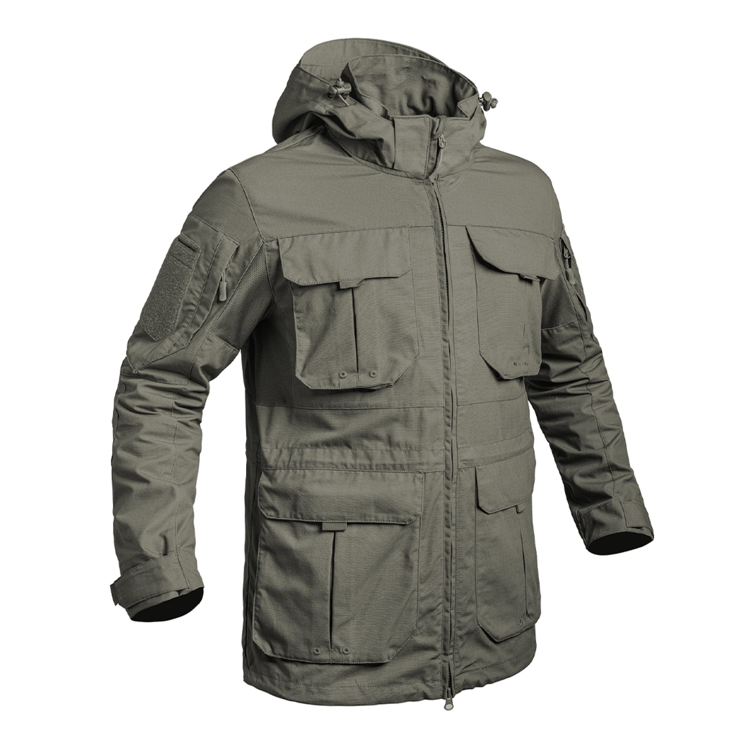 La giacca con cappuccio FIGHTER del produttore francese A10 equipment si ispira ai modelli militari e combina resistenza, comfort e praticità. È realizzata in tessuto trattato con tecnologia Ripstop 5.0 e rifinita con teflon, che garantisce impermeabilità, resistenza allo sporco e alle macchie, ed è inoltre dotata della tecnologia IR-PROTECT per la protezione nello spettro infrarosso. La giacca è dotata di una chiusura con cerniera a doppio cursore e di una chiusura in velcro in vita. Le cuciture principali sono doppie e i gomiti sono rinforzati per una maggiore resistenza.