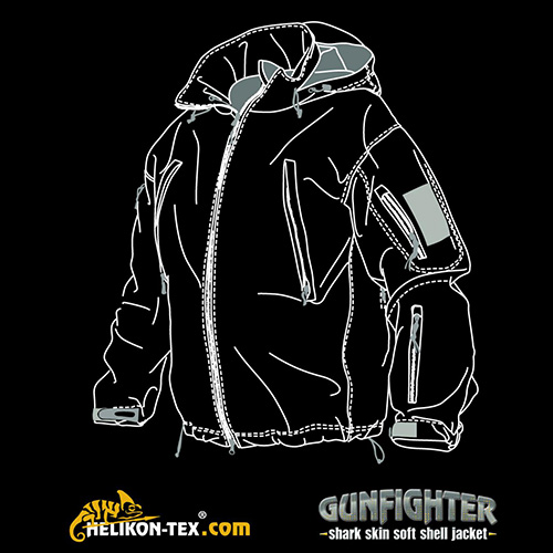 Giacca softshell leggera Gunfighter realizzata in Shark Skin, un tessuto elastico a tre strati che offre un adeguato isolamento termico, protezione dal vento e dall'umidità e allo stesso tempo è molto traspirante. La superficie esterna è rivestita in teflon per una migliore protezione dall'acqua e dallo sporco. L'interno è in morbido pile e fodera in rete. Il cappuccio può essere facilmente regolato senza togliere le mani dalle tasche grazie ai cordoncini nascosti in entrambe le tasche anteriori.