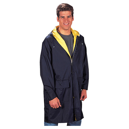 Giacca impermeabile reversibile con cappuccio. Se necessario, la giacca può essere capovolta e indossata con il lato colorato all'esterno. Il lato esterno (blu scuro) è realizzato in 100% poliestere, mentre quello interno (giallo segnaletico) è in PVC gommato. Questa combinazione di materiali garantisce una resistenza e un'impermeabilità eccellenti.