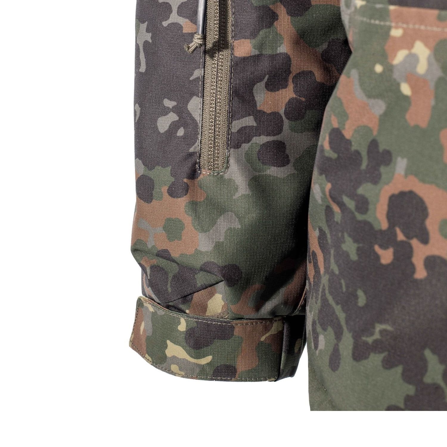 La giacca è dotata di una chiusura centrale con cerniera a doppio cursore che termina nel colletto con una protezione per il collo. Il colletto stesso è rialzato e dispone di un cappuccio profondo e regolabile con visiera. Le due tasche sul petto con chiusura a cerniera sono molto capienti e foderate con morbido pile per massimizzare il comfort termico. Le due tasche sulle spalle sono dotate di pannelli in VELCRO sul lato esterno per la personalizzazione con toppe in velcro. Sull'avambraccio si trovano due tasche più piccole destinate a riporre piccoli oggetti che si desidera avere a portata di mano. L'ultima tasca si trova all'interno della giacca e può essere utilizzata, ad esempio, per riporre piccoli oggetti come il portafoglio, il cellulare, ecc. Le maniche possono essere regolate in larghezza tramite cinturini con velcro. Anche l'orlo inferiore della giacca è regolabile.