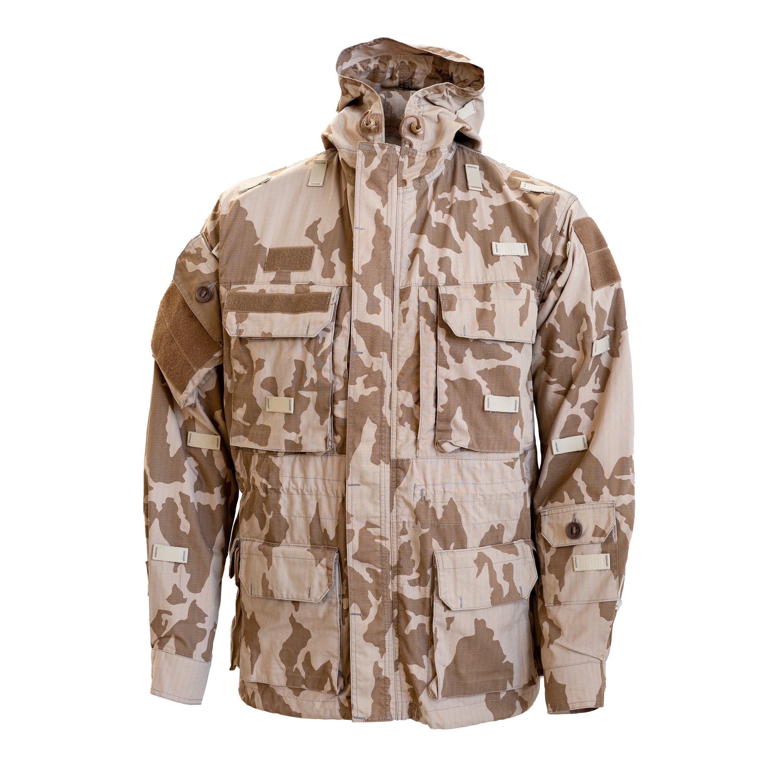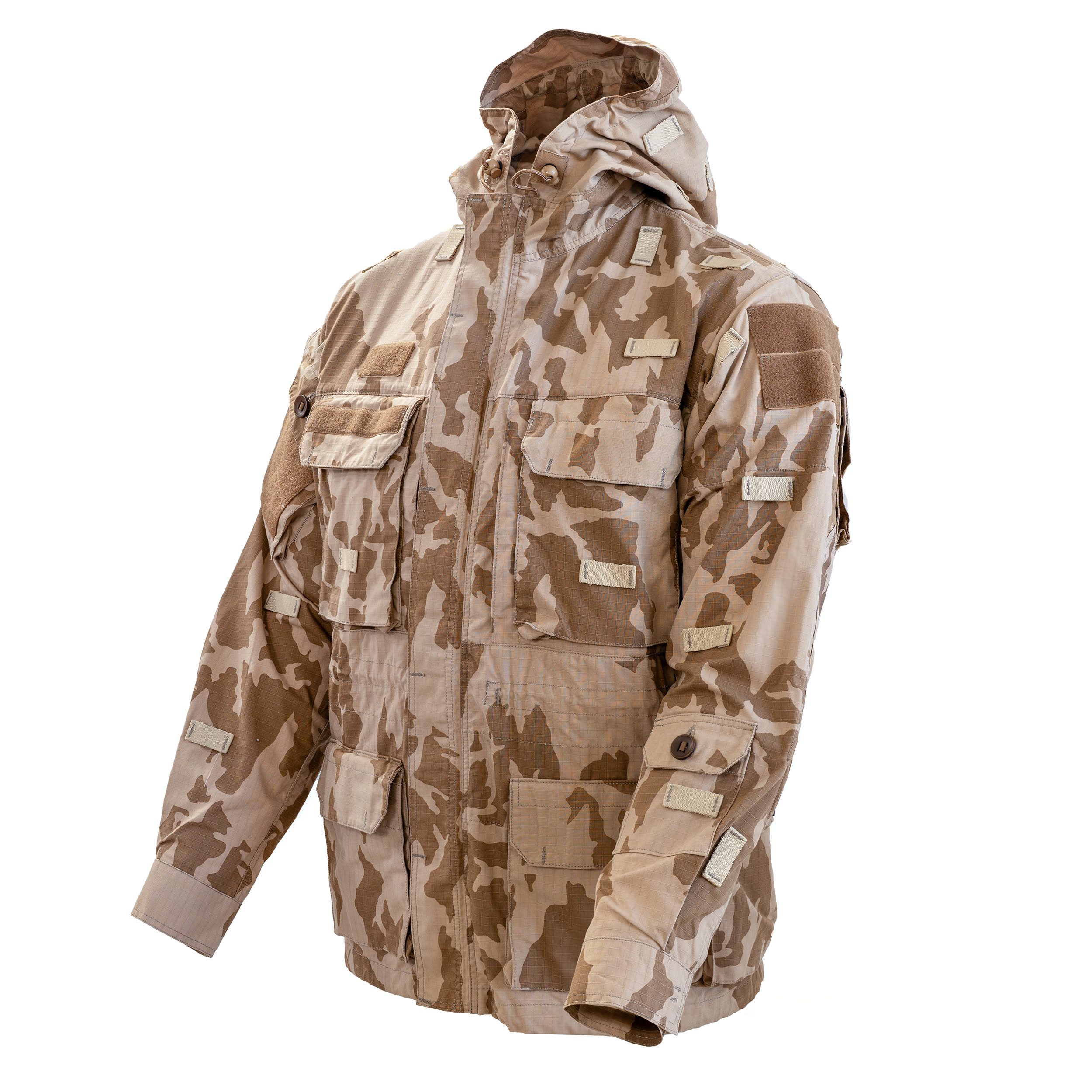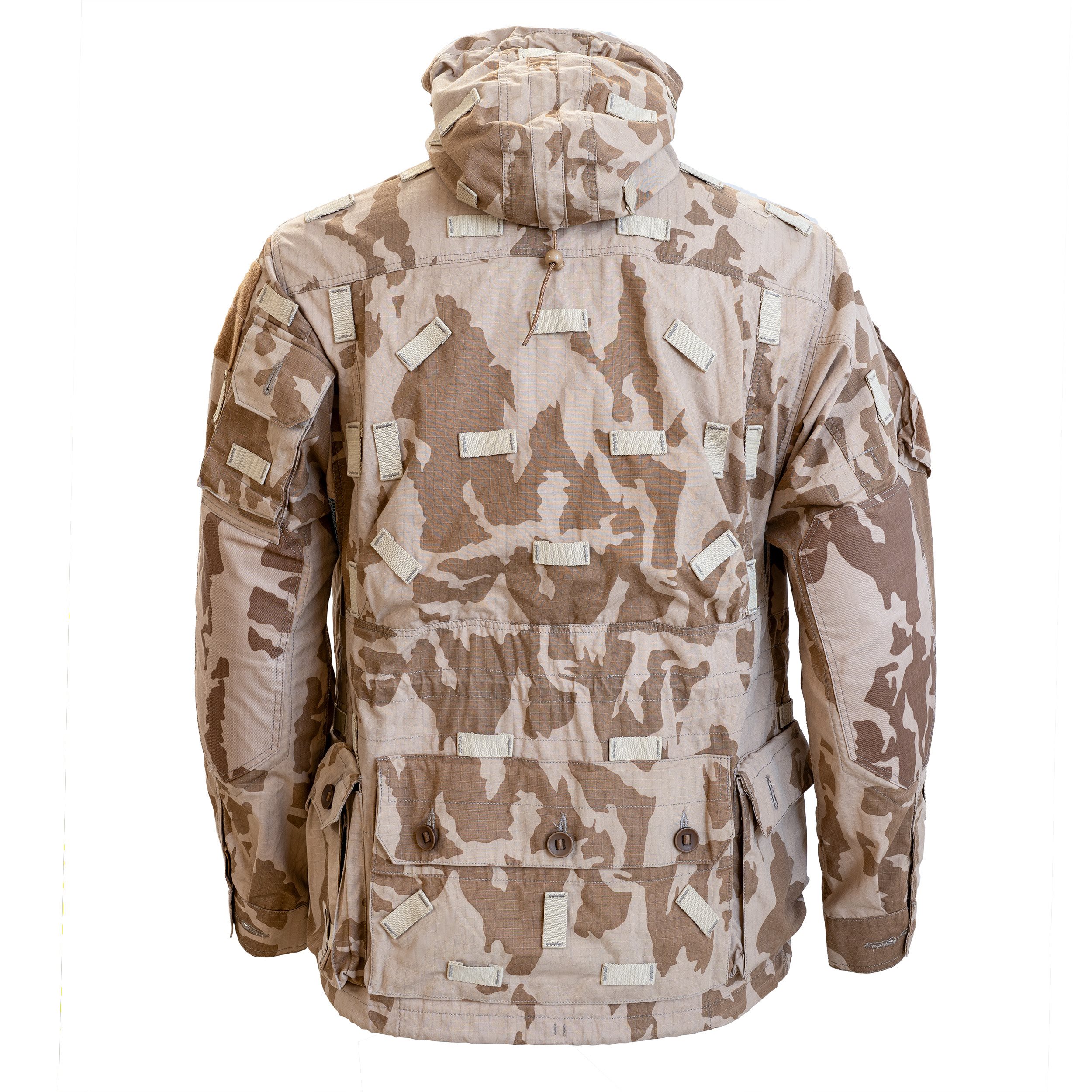 Giacca tipo "smock" con cappuccio regolabile, passanti per fissare la mimetizzazione e numerose tasche per riporre una grande quantità di equipaggiamento. Ulteriori informazioni