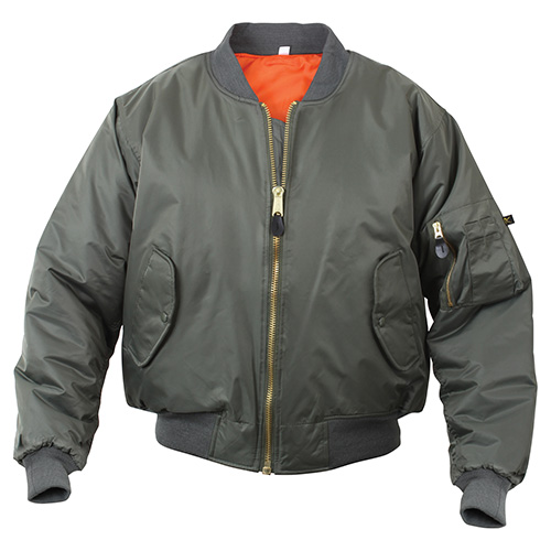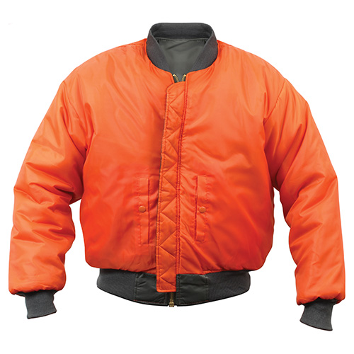 Classica giacca impermeabile da pilota tipo MA-1 (bomber). Questo modello è stato introdotto nell'equipaggiamento dell'aeronautica militare statunitense a metà degli anni '50 e ha mantenuto la sua popolarità fino ad oggi. La giacca è imbottita e quindi adatta al clima più freddo. Può essere rovesciata, con la fodera arancione segnaletica all'esterno.