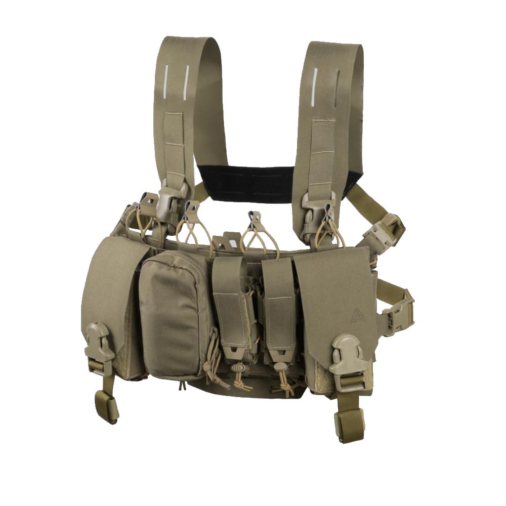 Chest rig minimalista basato sul gilet Hurricane, semplificato grazie alla rimozione dei pannelli modulari laterali e della chiusura centrale. Ideale per l'uso al poligono di tiro o in combinazione con un portapiastre / giubbotto antiproiettile.