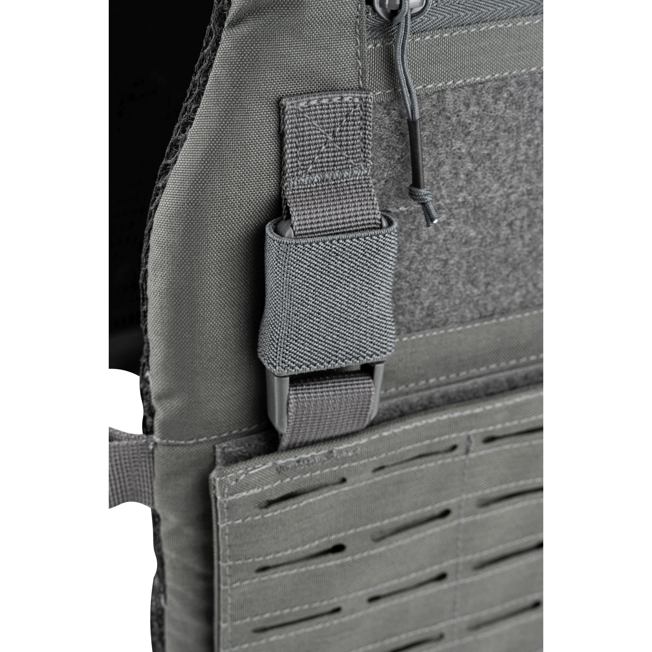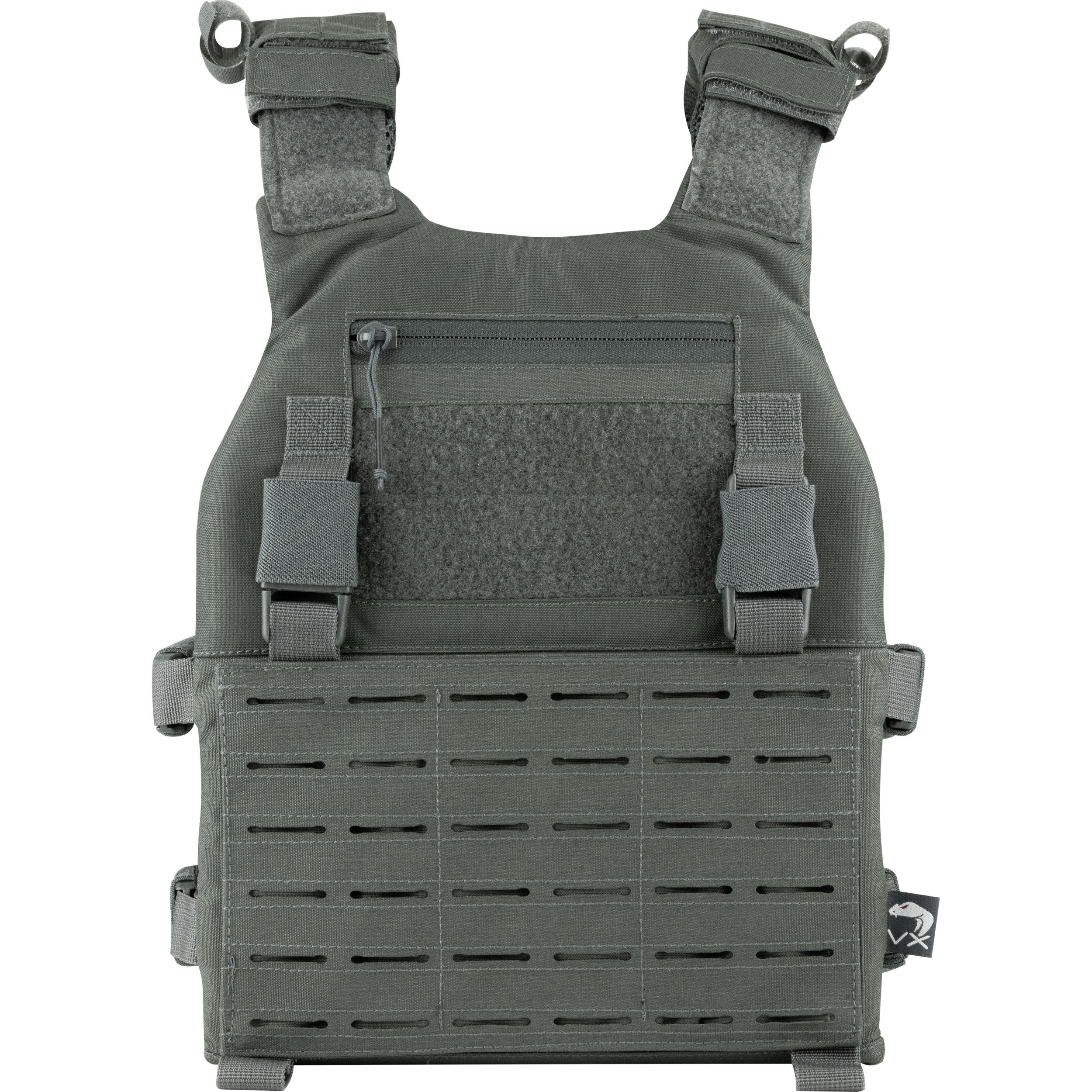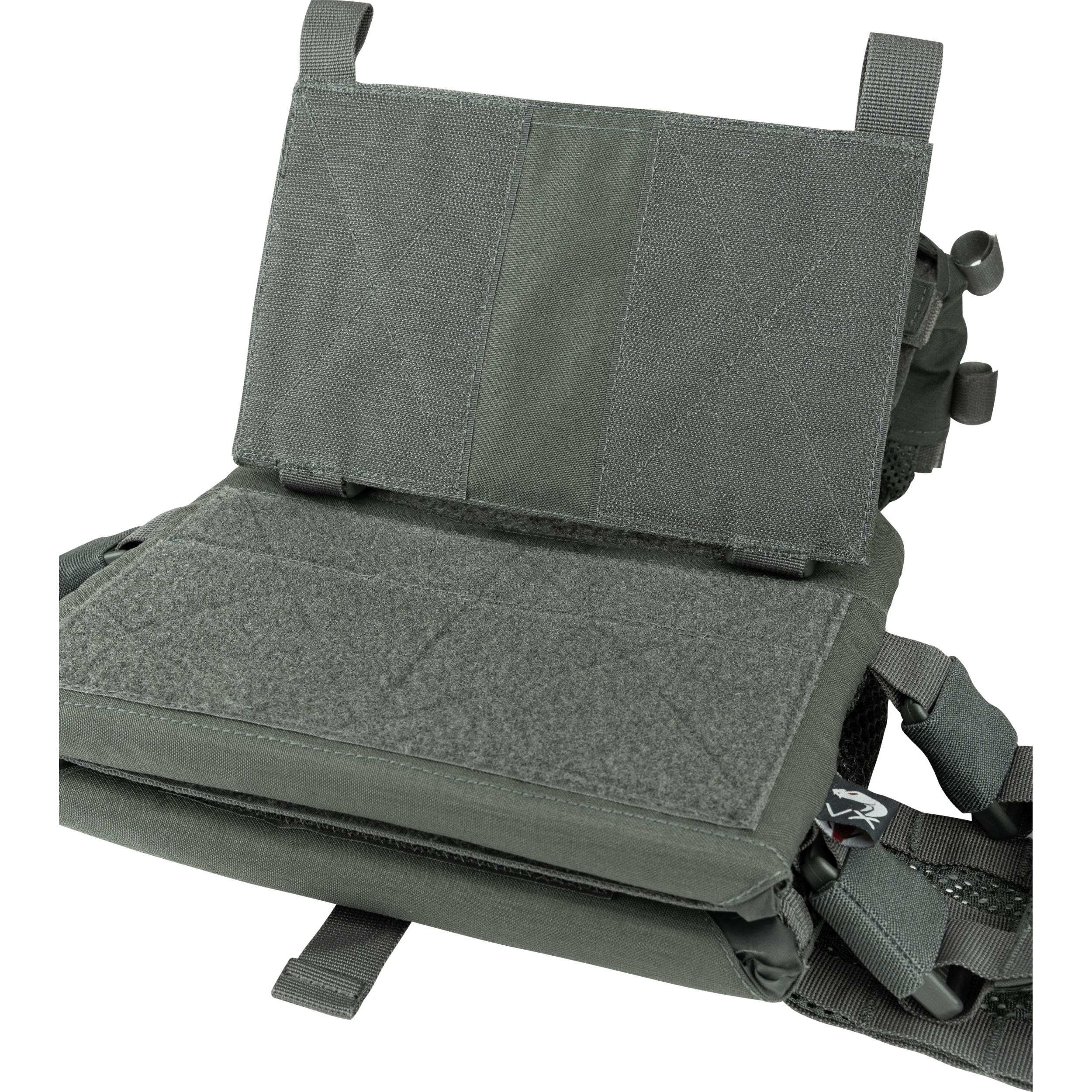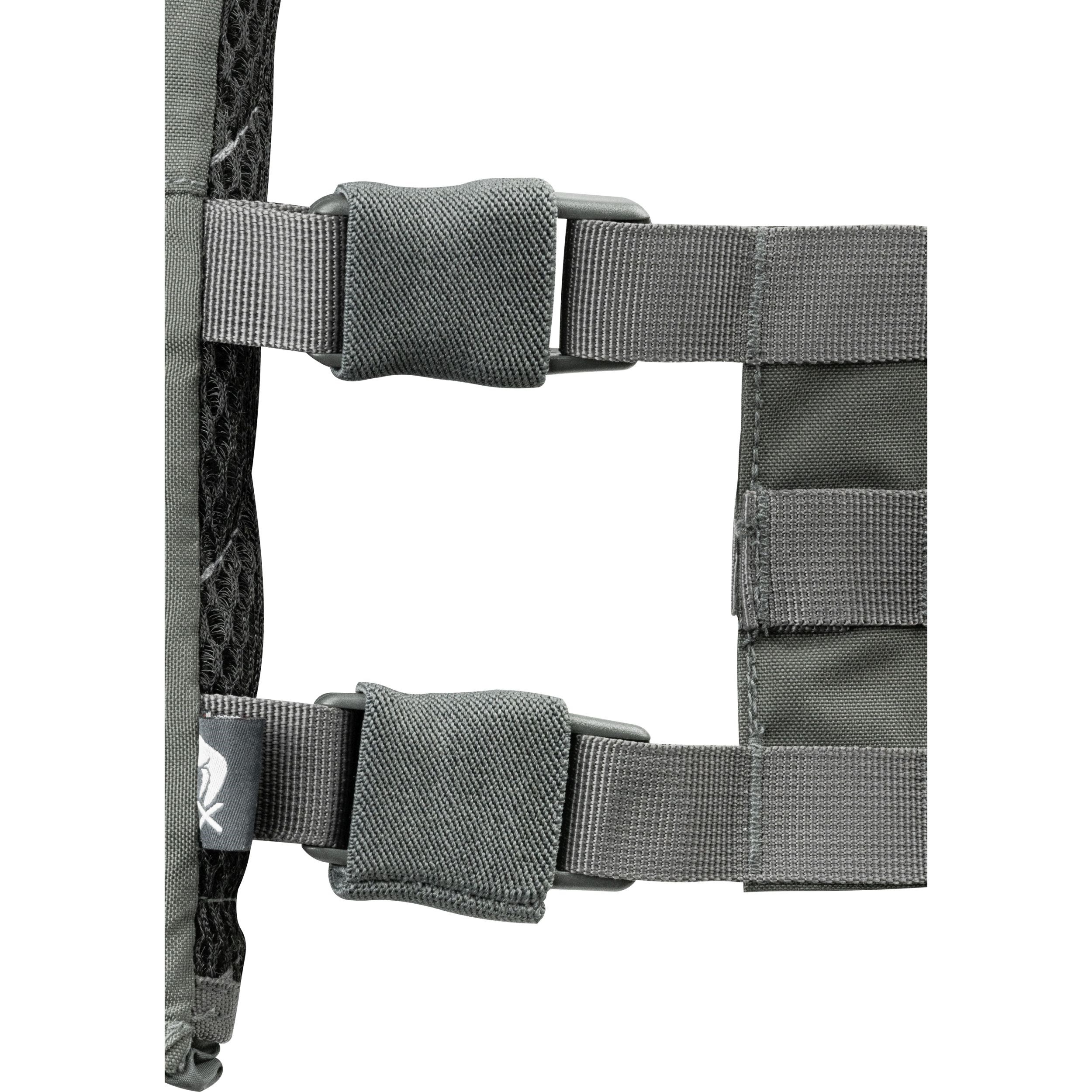 La parte anteriore e posteriore del supporto sono ricoperte da una trama MOLLE/PALS che consente di fissare una serie di accessori compatibili. Se necessario, il pannello frontale della trama può essere sostituito o rimosso e non utilizzato. Sopra il pannello frontaleMOLLE si trova un pannello VELCRO per le vostre toppe e una piccola tasca piatta adatta per documenti di piccole dimensioni. Un'altra possibilità per fissare accessori aggiuntivi è offerta dalle fibbie FASTEX compatibili con il sistema VX.