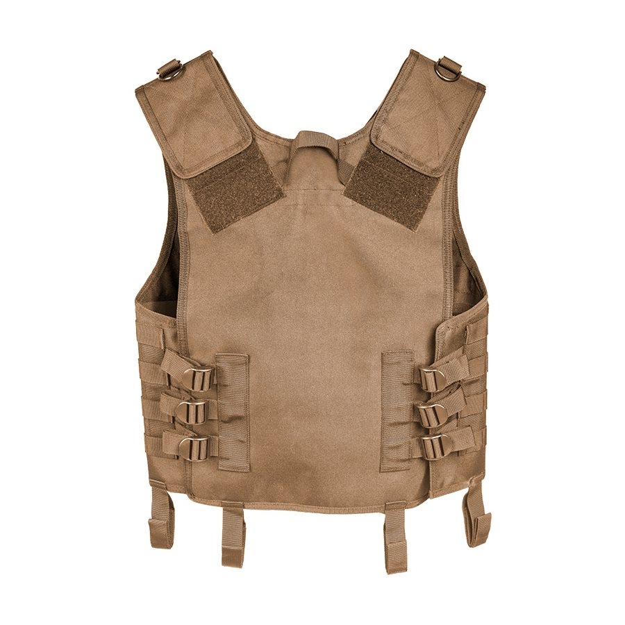 Comodo gilet tattico realizzato in poliestere resistente. Si chiude con una robusta cerniera centrale, completata da tre fibbie FASTEX in plastica. Il gilet può essere facilmente regolato sui fianchi tramite fibbie e sulle spalle tramite velcro. La parte anteriore del gilet è ricoperta da un sistema di aggancio MOLLE/PALS che consente di fissare accessori compatibili. Nella parte posteriore è presente una maniglia di sicurezza. Nella parte inferiore sono presenti sei passanti per il fissaggio della cintura.