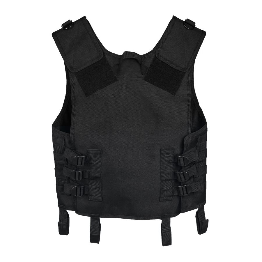 Comodo gilet tattico realizzato in resistente poliestere. Si chiude con una robusta cerniera centrale, completata da tre fibbie FASTEX in plastica. Il gilet può essere facilmente regolato sui fianchi tramite fibbie e sulle spalle tramite velcro. La parte anteriore del gilet è ricoperta da un sistema di aggancio MOLLE/PALS che consente di fissare accessori compatibili. Nella parte posteriore è presente una maniglia di sicurezza. Nella parte inferiore sono presenti sei passanti per il fissaggio della cintura.