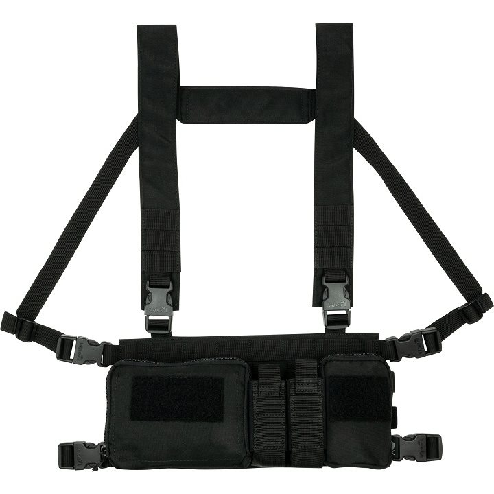 Chest rig minimalista per tiratori con diverse tasche cucite fisse e scomparto per tasche elastiche inseribili (inserti).