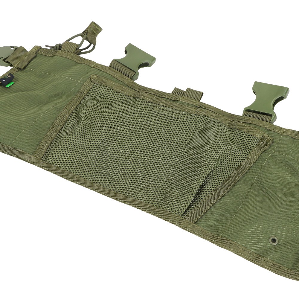 Gilet OPS Chest Rig del produttore americano Condor Outdoor, gilet tattico dal taglio classico con ampio pannello frontale dotato di sistema PALS per il fissaggio personalizzato degli accessori MOLLE. Il pannello presenta quattro file di agganci PALS, due tasche laterali integrate aperte per caricatori e una tasca frontale principale di 18 x 28 cm, ad esempio per una mappa. Il pannello è dotato di spallacci imbottiti incrociati con fibbie posteriori girevoli Swivi Lockster fastex . Nella parte superiore, le cinghie sono dotate di anelli a D. Il gilet ha una cinghia lombare regolabile su entrambi i lati.