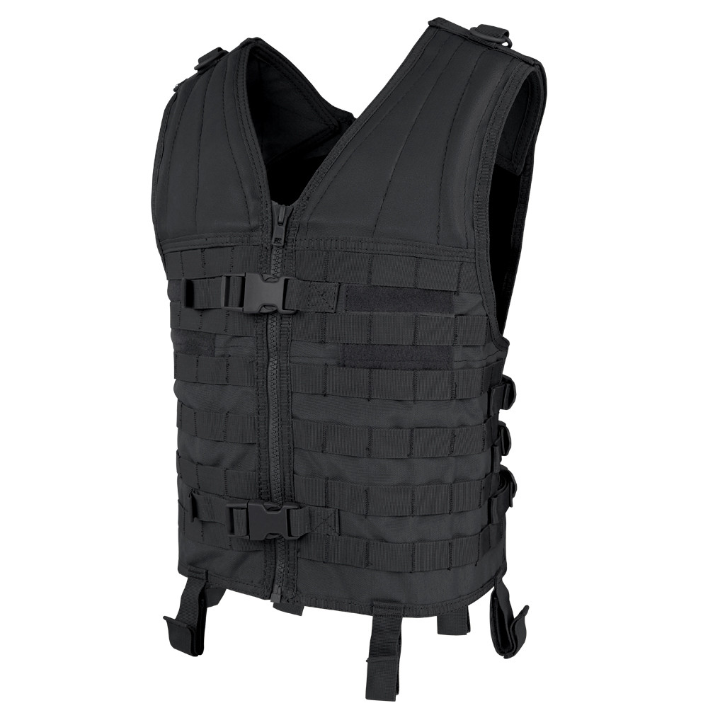 Gilet tattico Modular Style dell'azienda americana Condor Outdoor, gilet dal taglio classico, dotato di numerose cinghie PALS per il fissaggio personalizzato dell'equipaggiamento MOLLE. Il gilet è regolabile in altezza sulle spalle tramite velcro, nella parte anteriore delle spalle è presente un'imbottitura con rivestimento laterale per una migliore presa dell'impugnatura dell'arma e l'assorbimento del rinculo. La larghezza del gilet è regolabile tramite sei cinturini e fibbie di chiusura sui fianchi. La chiusura del gilet è a zip, fissata da due fibbie fastex. L'orlo inferiore del gilet è dotato di sei passanti per il fissaggio alla cintura. Il gilet ha due tasche interne in rete con zip. Nella parte anteriore e posteriore sono presenti pannelli in VELCRO (velcro) per il fissaggio delle etichette.