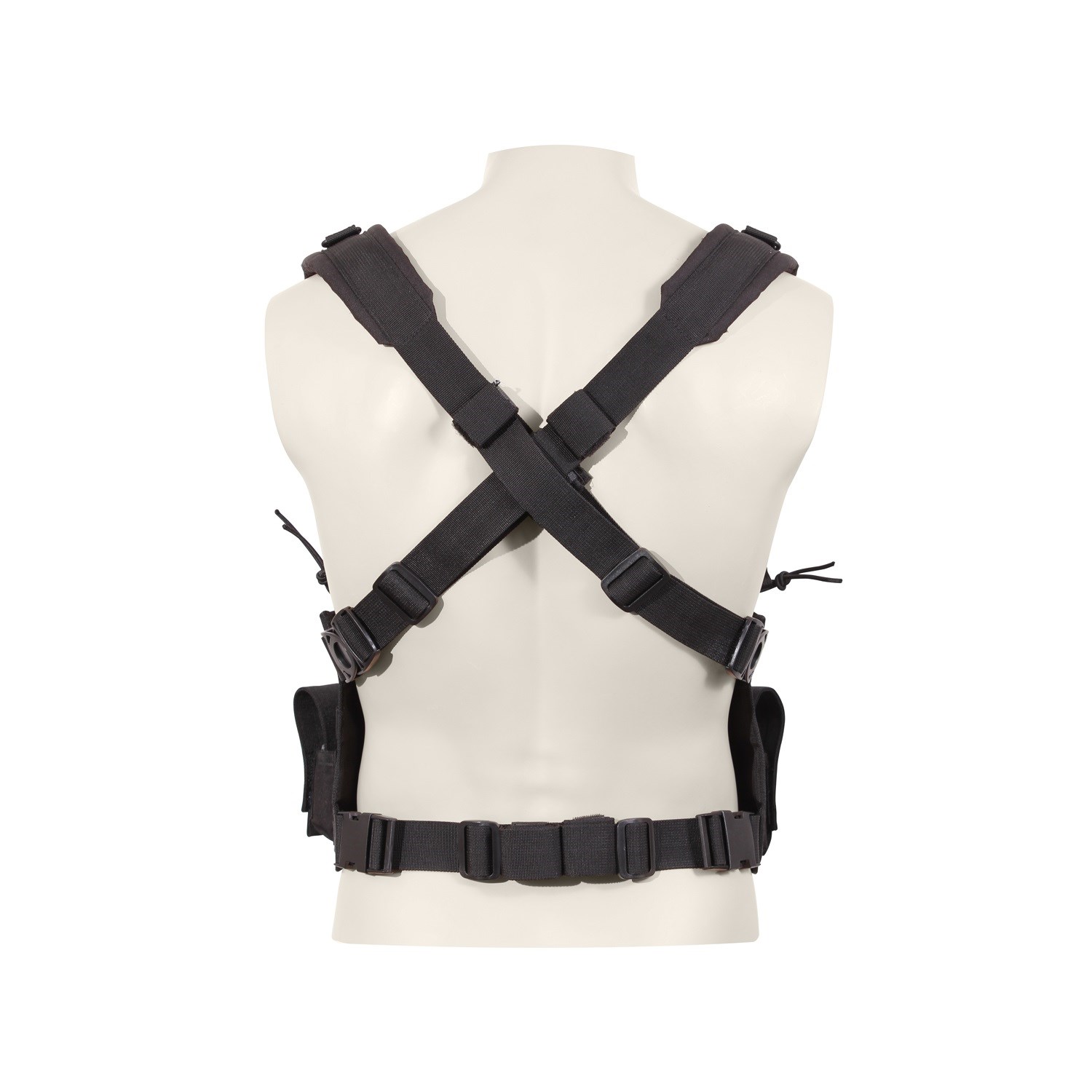 Il gilet tattico Operators Chest Rig del produttore ROTHCO è un gilet professionale. L'intera realizzazione del gilet è di alta qualità, con particolare attenzione alla resistenza e alla lunga durata. Il gilet è dotato di 3 tasche doppie aperte con elastico per caricatori di grandi dimensioni, con fori di drenaggio sul fondo e 3 tasche doppie per caricatori di pistola. Le tasche per caricatori di piccole dimensioni si chiudono con una patta in velcro. Le tasche sono fissate al gilet con il sistema modulare MOLLE. Inoltre, il gilet offre una tasca imbottita in rete per documenti di circa 23 cm e 15 cm. Gli spallacci sono ben imbottiti per il massimo comfort. Gli spallacci e la cintura ventrale sono regolabili in base alle esigenze. Materiale: poliestere 600D.