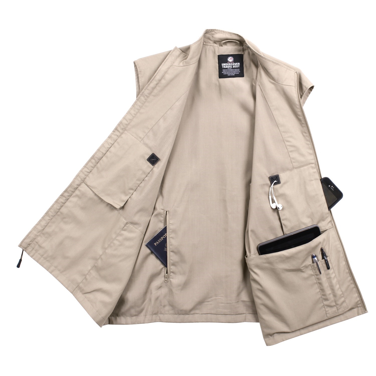 Gilet con numerose tasche discrete per riporre oggetti, piccoli dispositivi elettronici, documenti personali, ecc. Chiusura con cerniera. Materiale esterno: 55% cotone, 45% poliestere; interno: 65% poliestere, 35% cotone. Ulteriori informazioni