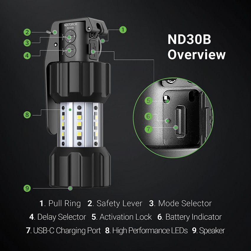Perché ND30B? Il granato elettronico di distrazione NEXTORCH ND30B è la scelta ideale per chiunque necessiti del massimo effetto senza l'uso di articoli pirotecnici. È riutilizzabile, estremamente potente e adatto sia per i professionisti che per gli utenti civili esigenti.