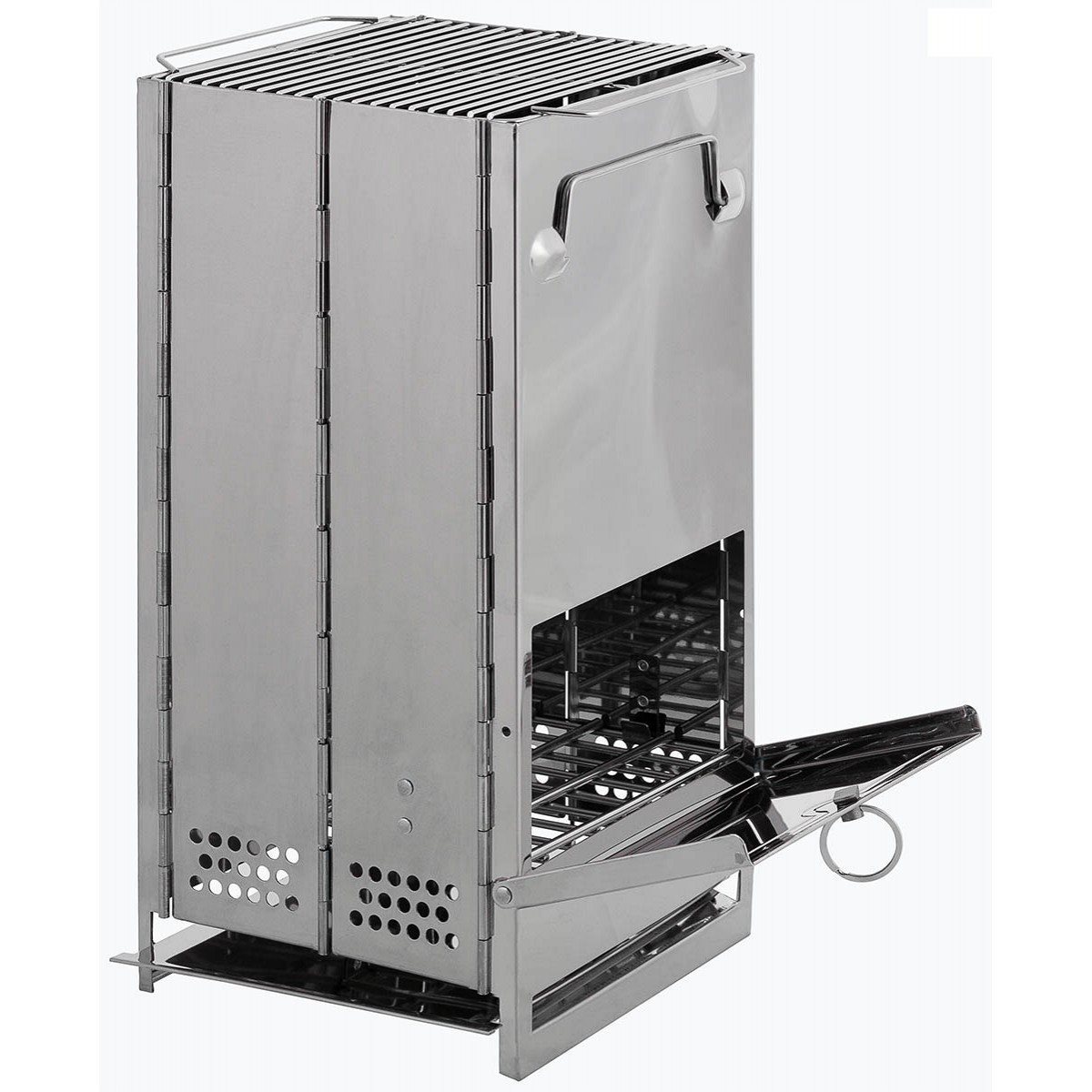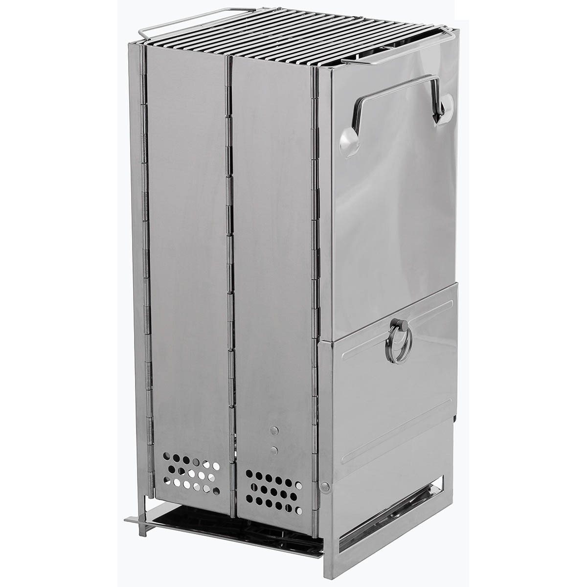 Grande barbecue in acciaio inossidabile con possibilità di smontaggio rapido e riporre nella borsa da trasporto in dotazione. È adatto per l'uso con combustibile solido. È facile da montare e smontare e la pulizia è questione di pochi istanti grazie alla griglia interna ribaltabile. Il barbecue è dotato di uno sportello frontale con chiusura di sicurezza, che può essere utilizzato per regolare l'intensità della fiamma, di aperture di ventilazione per l'effetto camino (che migliora notevolmente la velocità di cottura e l'efficienza del combustibile), di maniglie pieghevoli per un rapido trasporto da un luogo all'altro, di un cassetto raccogli cenere rimovibile e di una griglia. Grazie alla griglia, il barbecue è adatto sia per grigliare che per cucinare.