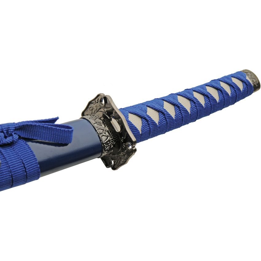 Set di repliche di tre leggendari spade giapponesi (Katana, Wakizashi, Tanto) con supporto in legno. Tutte e tre le spade hanno la lama smussata e l'impugnatura in nylon avvolta da un cordino blu. I foderi delle spade sono in legno e decorati con un motivo a forma di drago. Le lame non possono essere affilate.