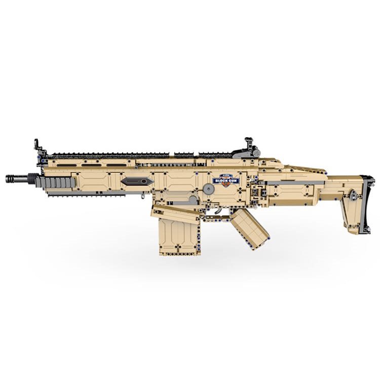 Kit di costruzione che consente a voi o ai vostri figli di assemblare un fucile d'assalto SCAR 17S "funzionante". Il kit contiene un totale di 1406 pezzi, è adatto a bambini dai 14 anni in su e, grazie al motore a batteria (1 batteria AA non inclusa nella confezione), è possibile sparare proiettili di plastica con il fucile assemblato.