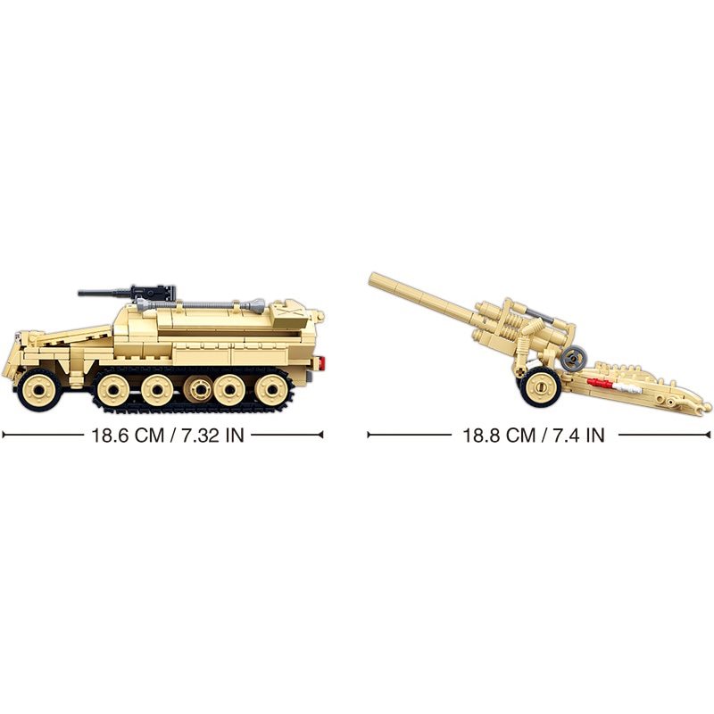 Kit di costruzione della seconda guerra mondiale contenente 460 pezzi, con i quali è possibile assemblare facilmente un veicolo semicingolato tedesco e un cannone da campo. Il kit è un regalo ideale per bambini o appassionati di storia militare. Adatto a partire dai 6 anni.