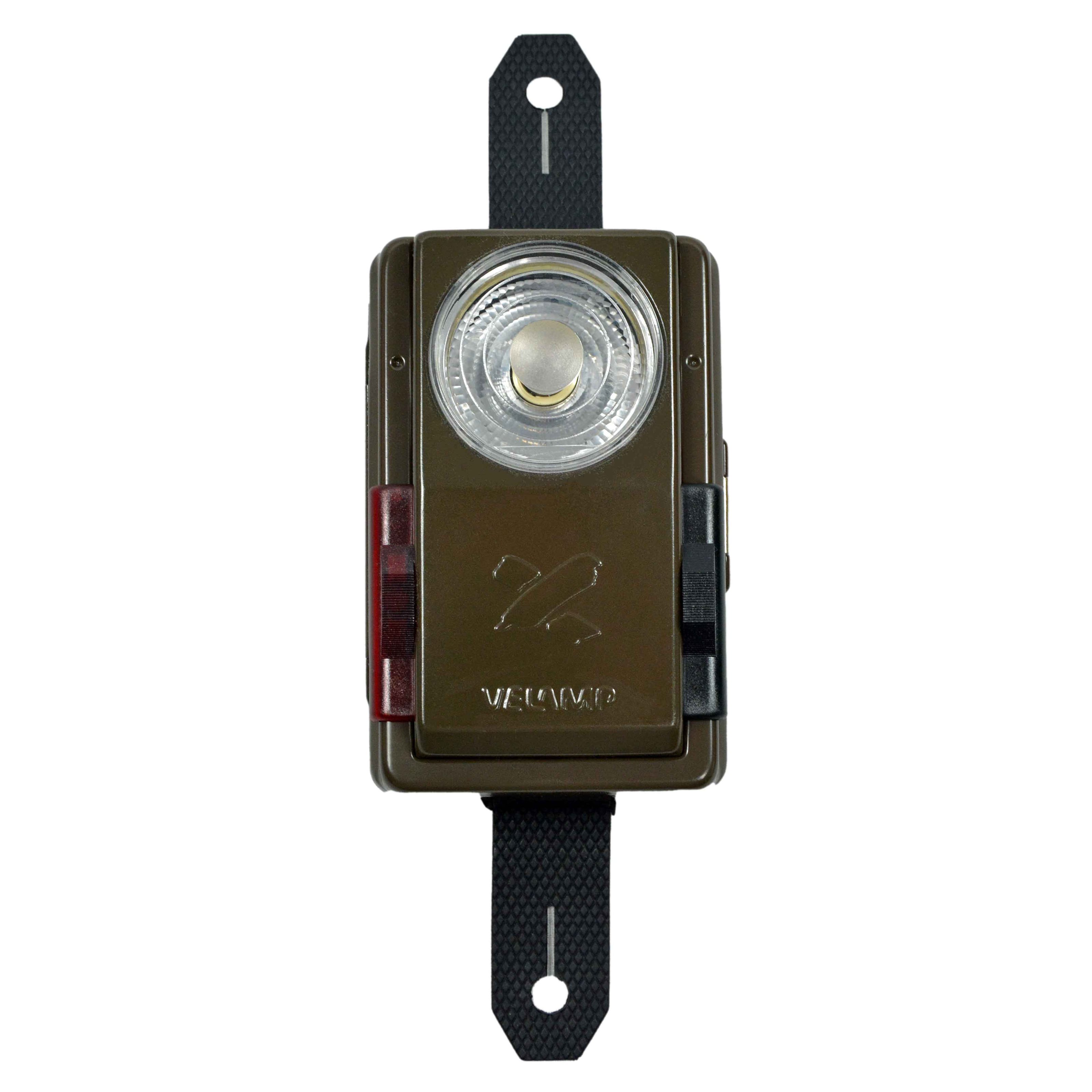 Torcia manuale con interruttore per luce "fissa" o segnalazione (codice Morse). Tramite i cursori è possibile impostare la luce verde o rossa. Originale dell'esercito norvegese, marca Velamp.