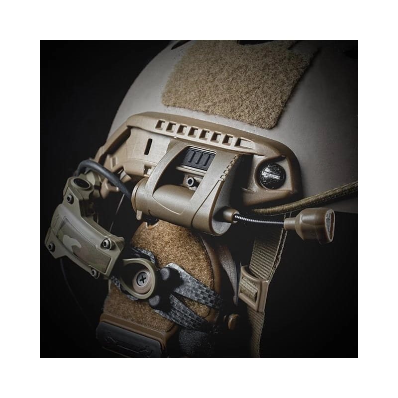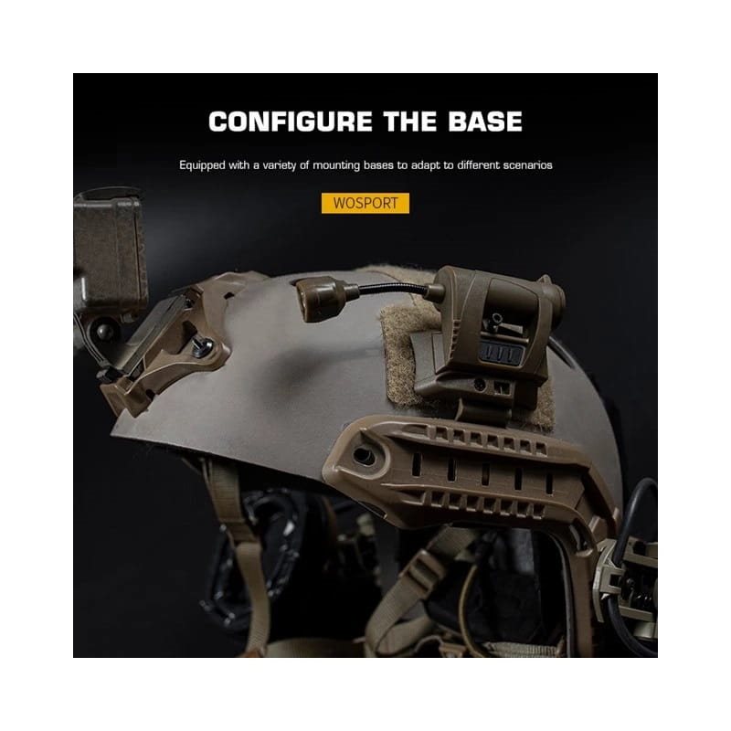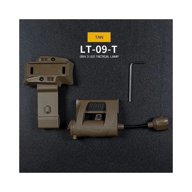 Torcia progettata per essere fissata su un elmetto tattico. La torcia illumina adeguatamente l'area davanti a voi, lasciando le mani libere per qualsiasi attività. La torcia può essere fissata sia tramite una guida sull'elmetto che tramite un pannello in velcro. Realizzata in materiale resistente.