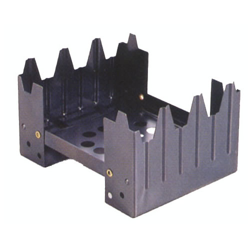 Fornello pieghevole in acciaio (lettino). Una volta ripiegato, misura circa 12,5 x 12,5 x 2,5 cm.