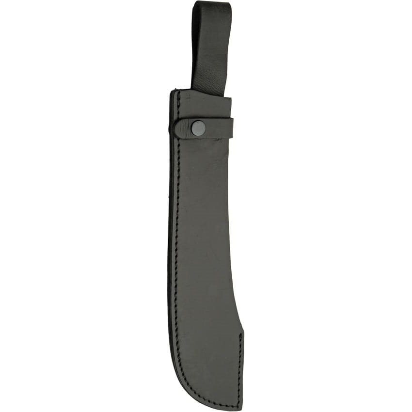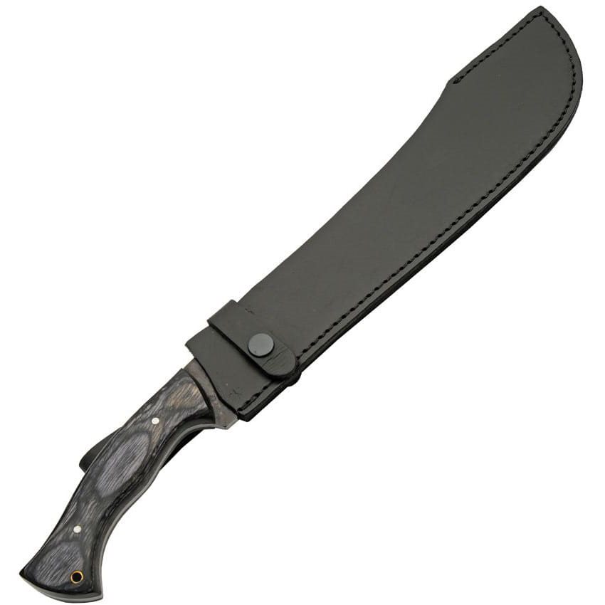 Elegante machete con struttura full tang. La lama è realizzata in acciaio al carbonio, lucidata solo in prossimità del filo liscio. L'estremità del filo è dotata di una pratica protezione che previene lesioni accidentali durante l'uso. Il manico leggermente ricurvo è realizzato in legno Pakkawood con finitura scura. Il Pakkawood si caratterizza per l'elevata resistenza e stabilità grazie al rinforzo esterno con resina. La machete è dotata di una custodia in pelle per il fissaggio alla cintura o ad altri accessori.