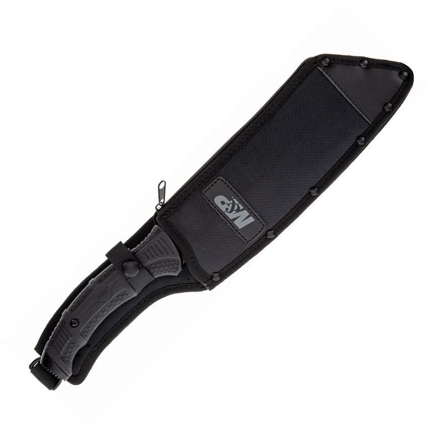 Robusta machete Cleaver (in italiano: mannaia) con dentellatura pronunciata sul dorso della lama. Impugnatura ergonomica e antiscivolo con terminale che può essere utilizzato come martello. La confezione include una custodia.