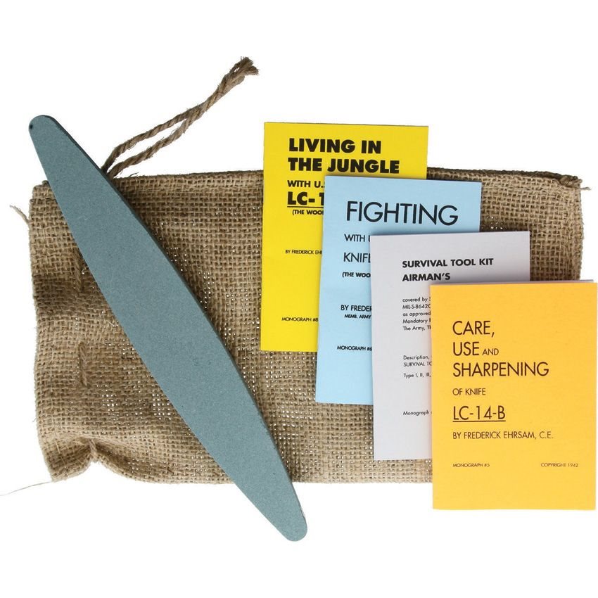 La machete viene fornita con una custodia da cintura, una pietra per affilare e copie autentiche dei manuali originali del 1941.