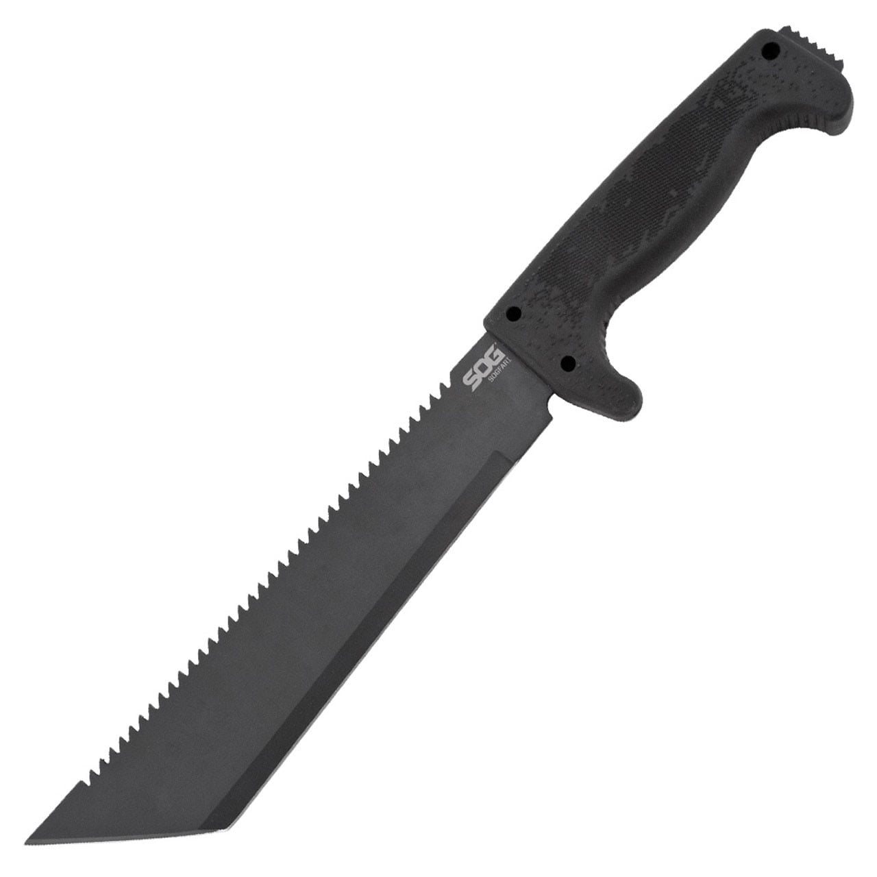 Pratica machete con lama liscia lunga 25,4 cm e forma tanto non tradizionale per una machete, caratterizzata da una punta molto pronunciata e affilata. La lama nera è realizzata in acciaio inossidabile 3Cr13 e sul dorso è presente una sega pronunciata. L'impugnatura è realizzata in materiale Kraton ed è sagomata in modo da garantire una presa ottimale in qualsiasi situazione. Per una maggiore sicurezza, nella parte anteriore è dotata di una protezione pronunciata. All'estremità dell'impugnatura si trova un foro per il passaggio del cordino di sicurezza e una sporgenza dentellata. La machete viene fornita con una custodia in nylon.