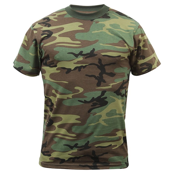 Maglietta militare mimetica a maniche corte con motivo mimetico US WOODLAND della ditta Rothco. Stampa di alta qualità. Doppie cuciture.