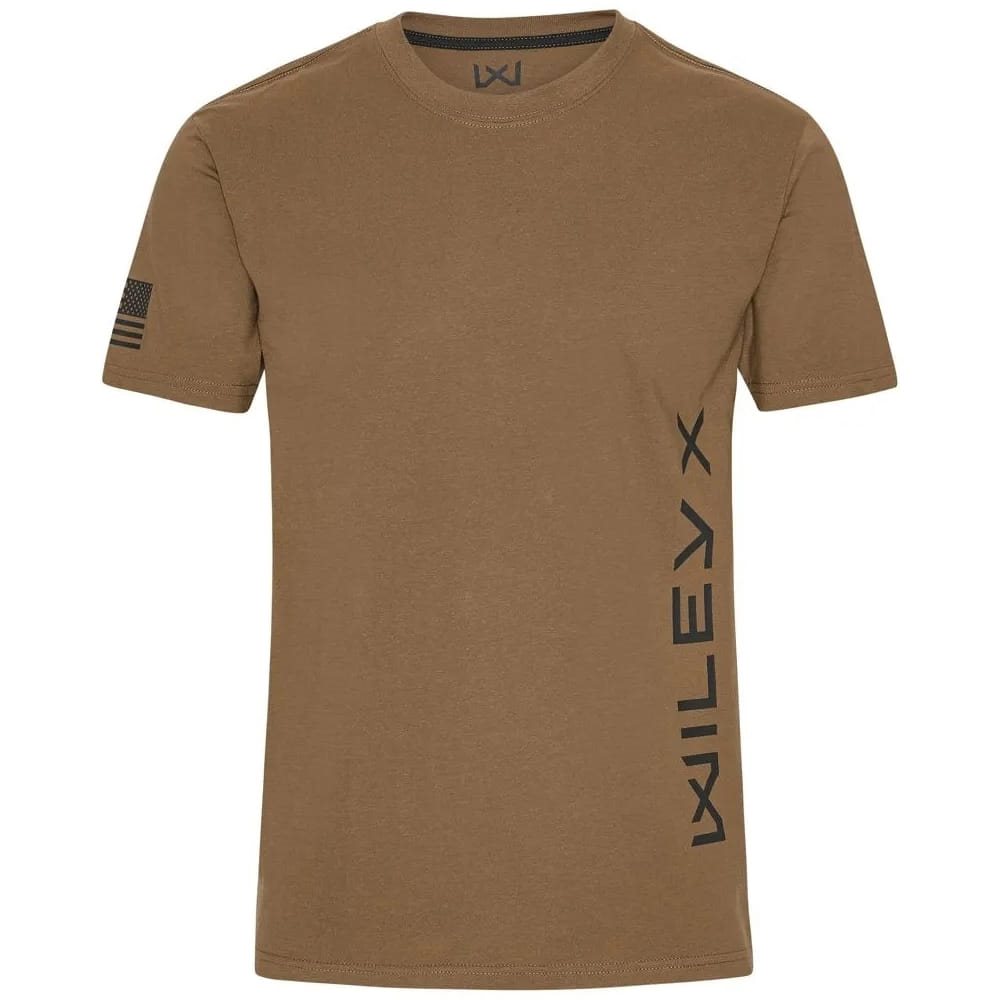 La maglietta è realizzata in 60% cotone e 40% poliestere, che garantiscono una qualità piacevole e morbida e il massimo comfort. È progettata con un grande logo Wiley X verticale a contrasto sul lato anteriore sinistro della maglietta e un'etichetta WX nella cucitura dell'orlo inferiore. Sulla manica destra è stampata la bandiera americana, con le stelle rivolte in avanti, proprio come sulle uniformi americane. Il collo rotondo e le maniche corte conferiscono a questa maglietta un look casual e sportivo. La maglietta è disponibile in diverse taglie e colori.